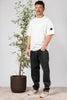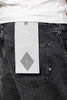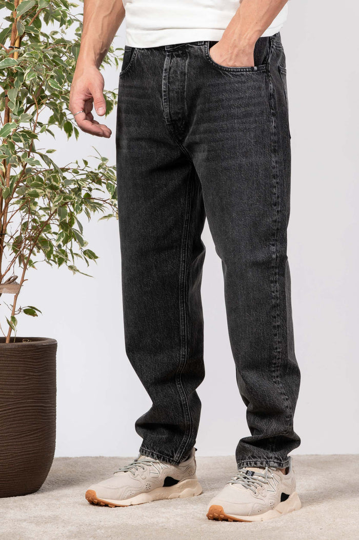 - Jeans tinta unita in denim. Vita alta, coscia larga e fondo stretto. Cinque tasche con piccola cucitura logo posteriore. Effetto lavato