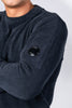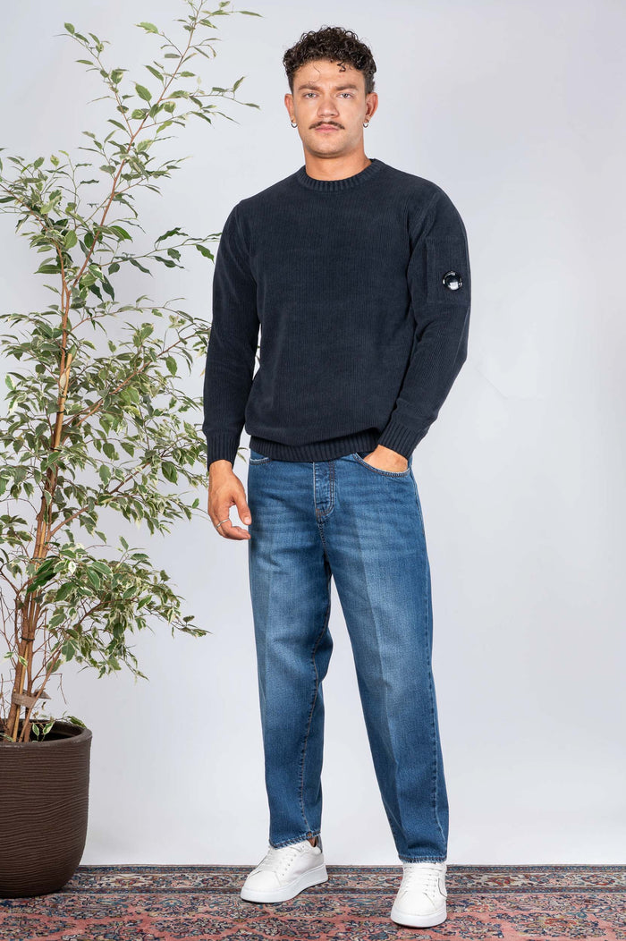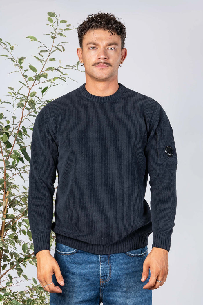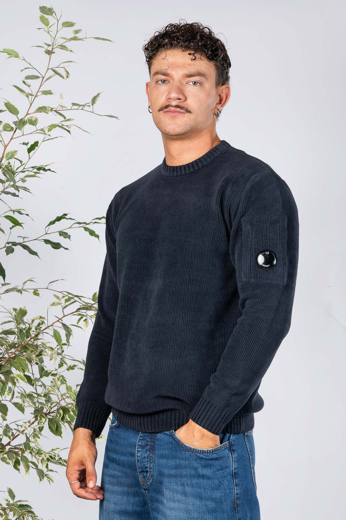 - Maglione girocollo tinta unita in cotone. Taschino sul braccio con logo iconico. Girocollo e polsini canettati. Fondo bastonetto.