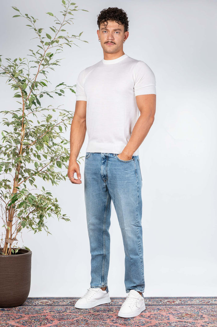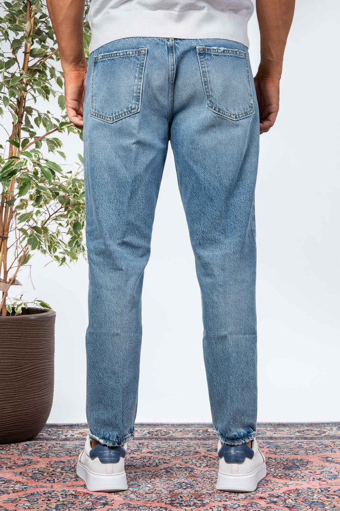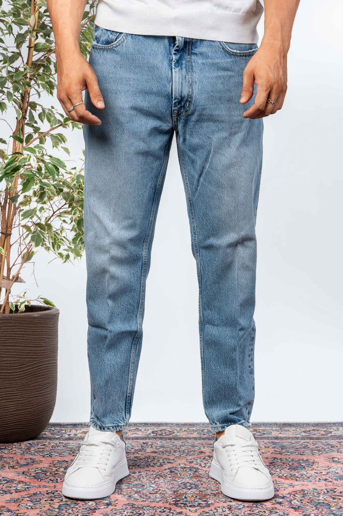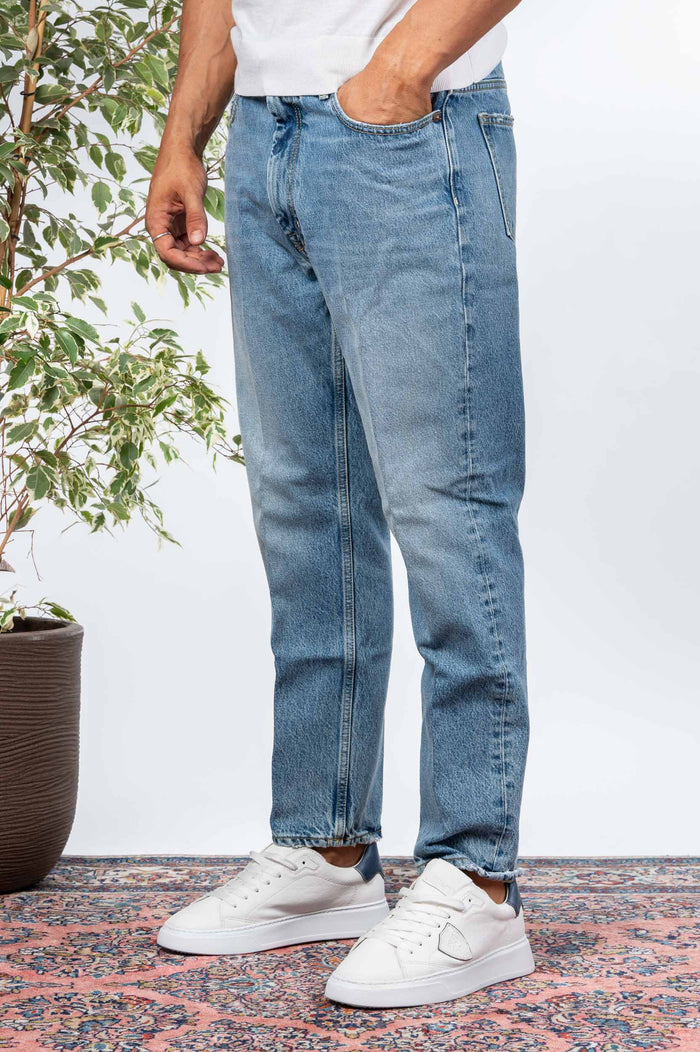 - Jeans slavato in cotone. Gamba regular con fondo più stretto. Etichetta posteriore con logo.