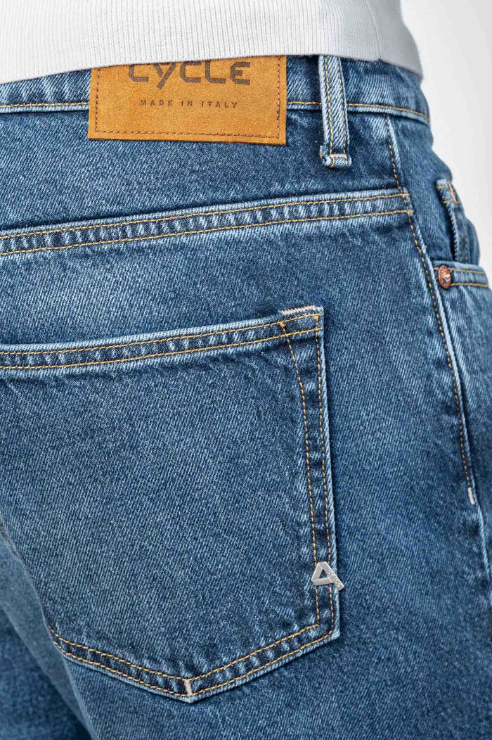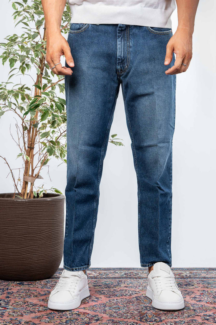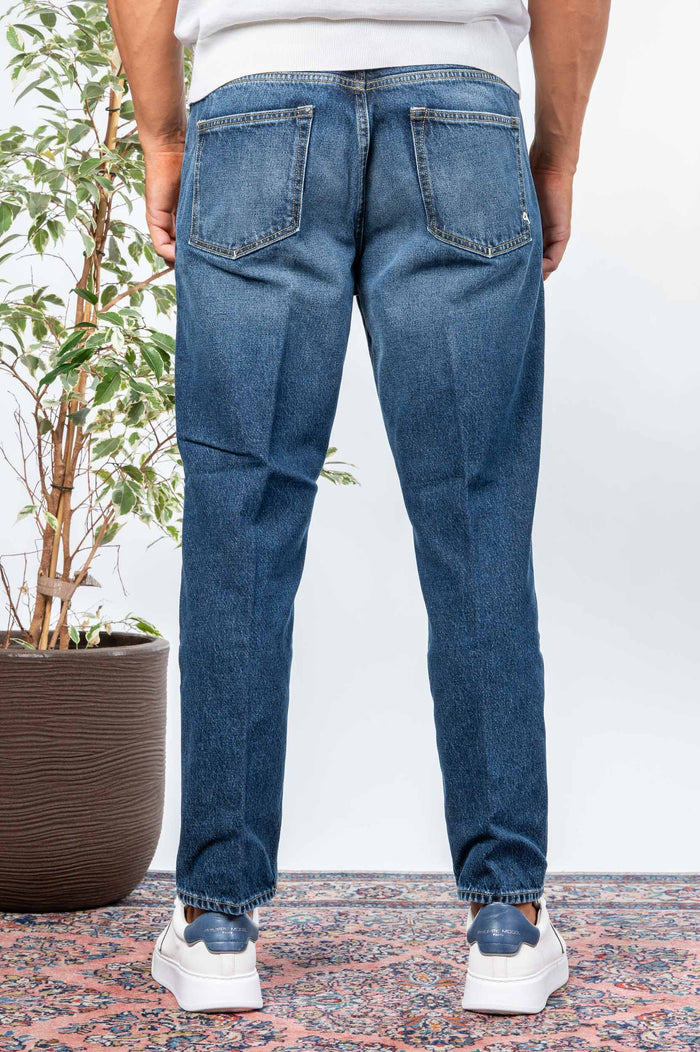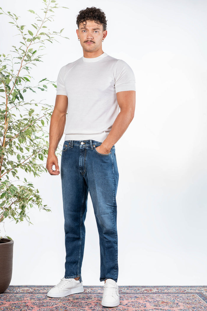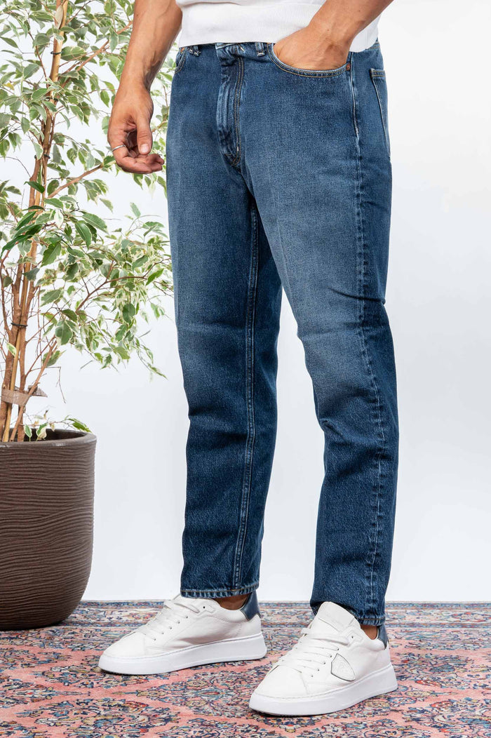 - Jeans slavato in cotone. Gamba regular con fondo più stretto. Etichetta posteriore con logo.