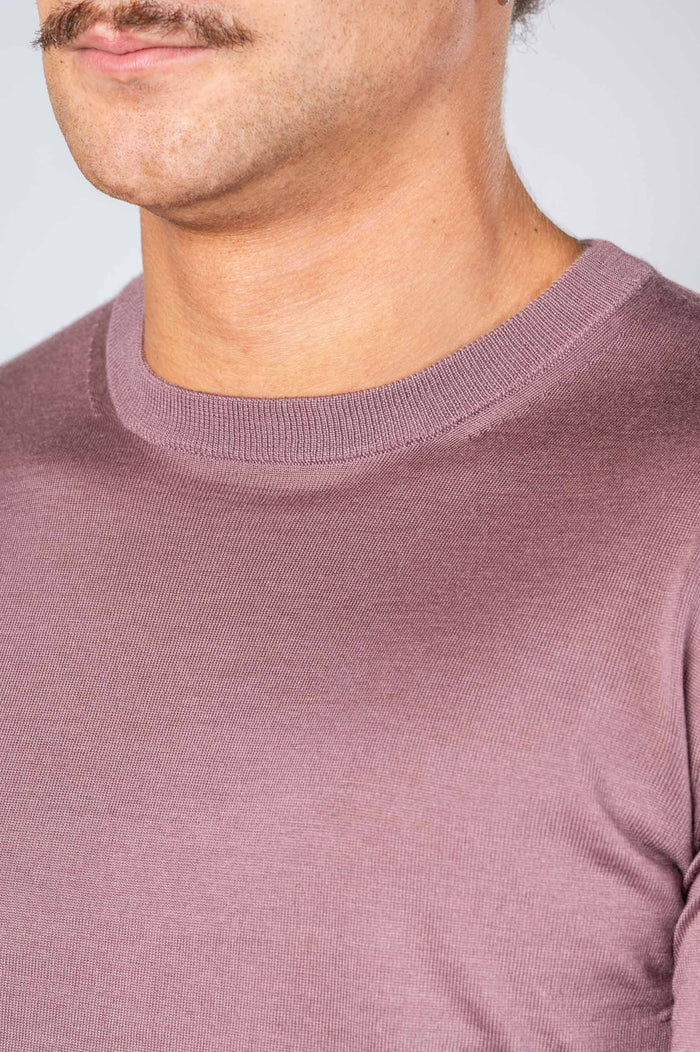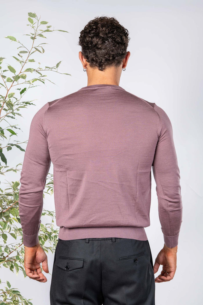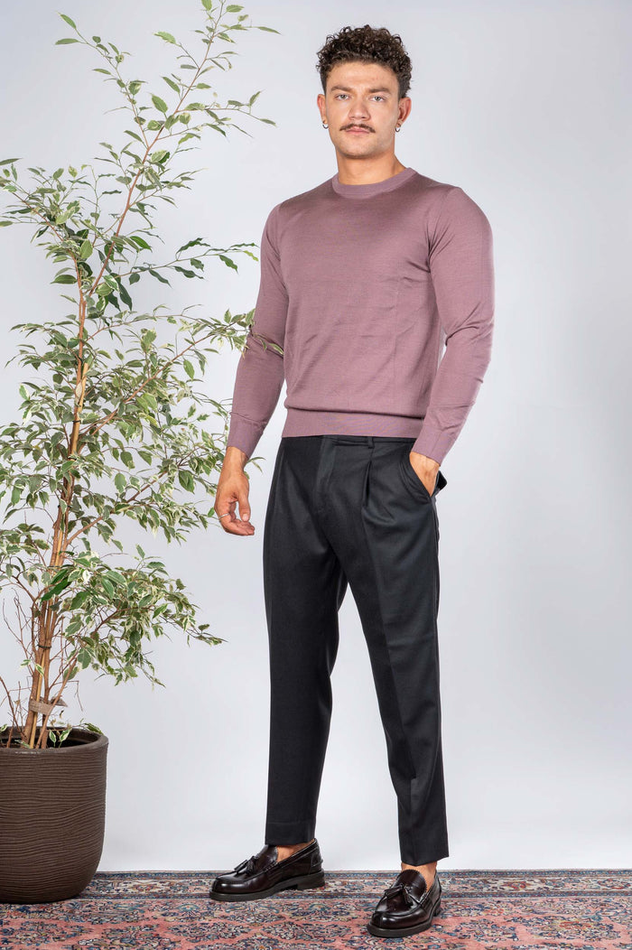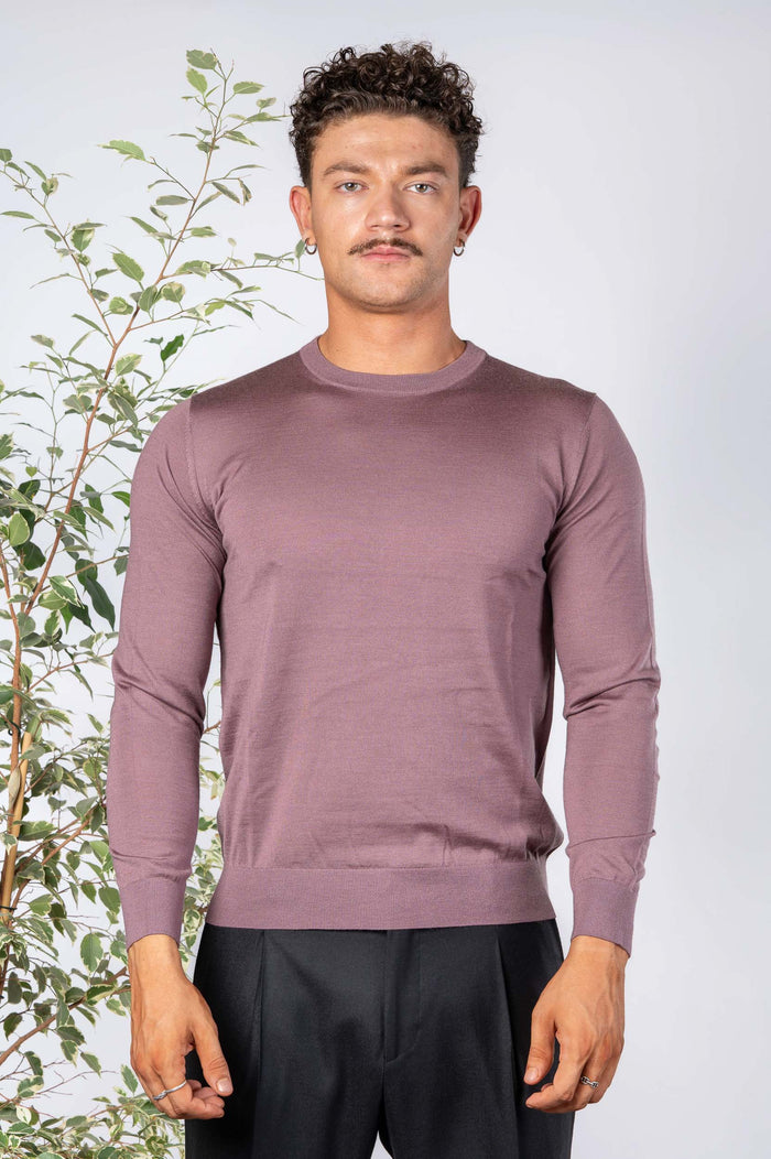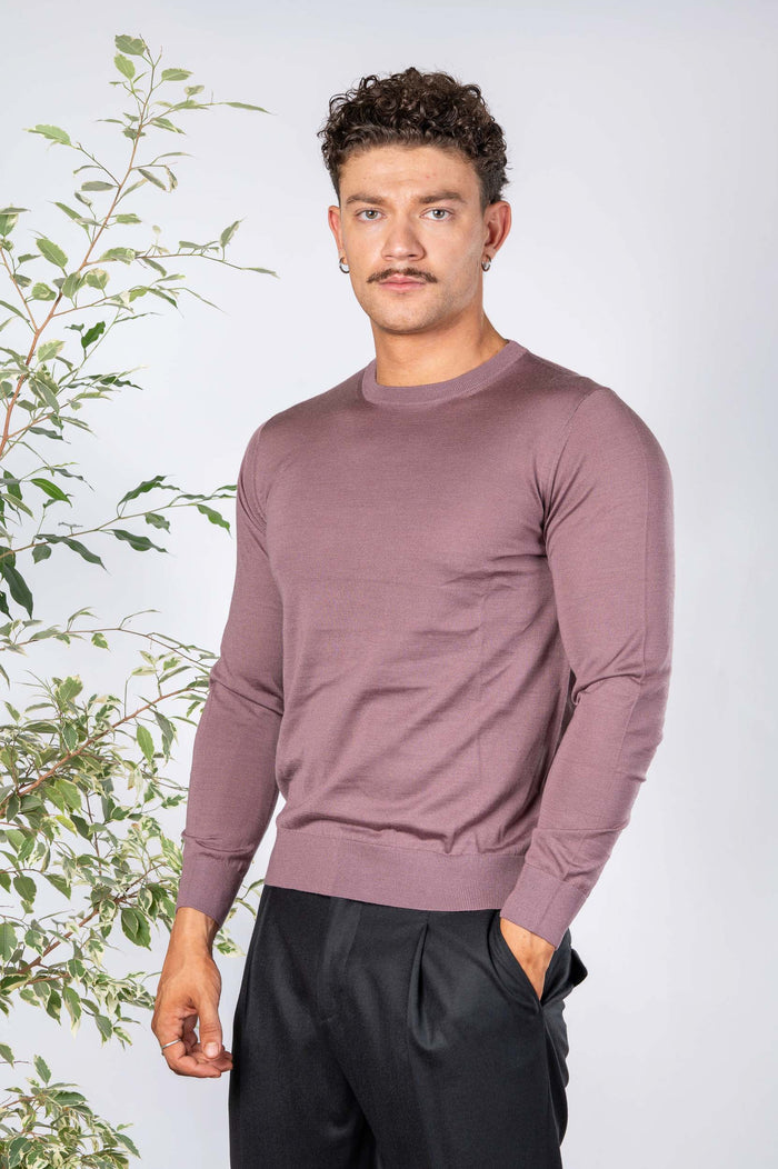 • Girocollo tinta unita in lana e seta. Maniche lunghe con polsino elasticizzato. Fondo con bastonetto. Made in Italy.