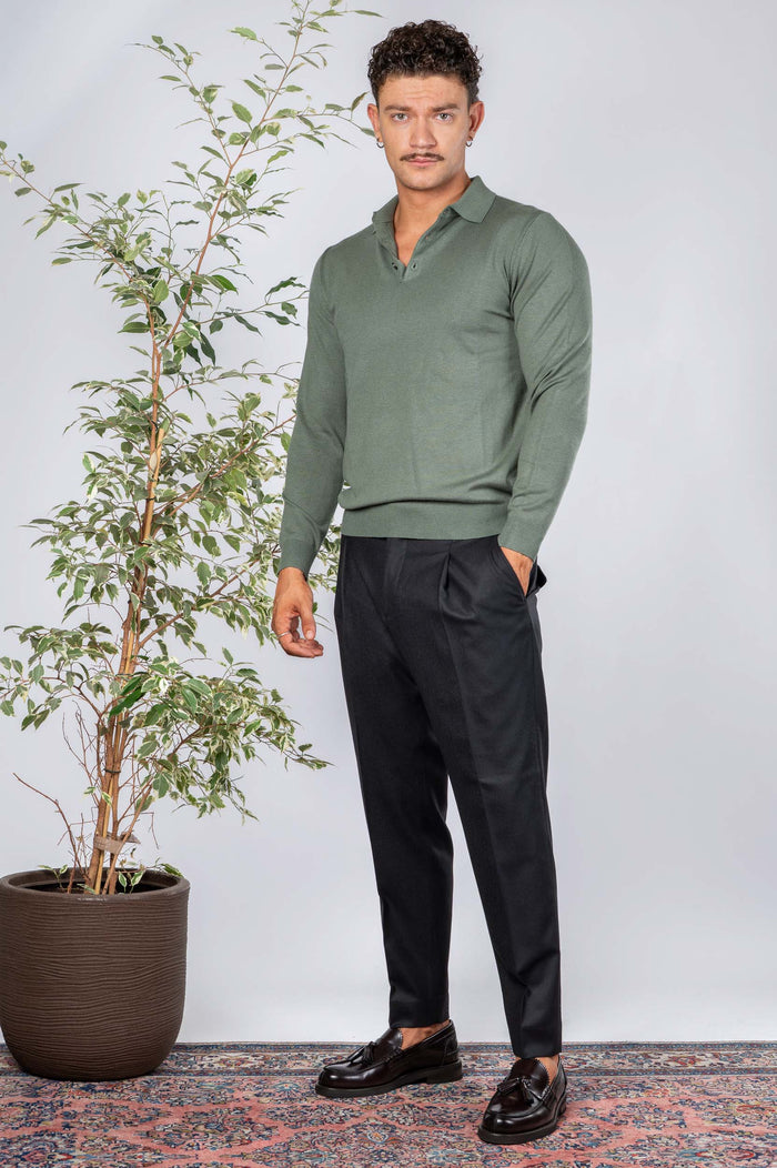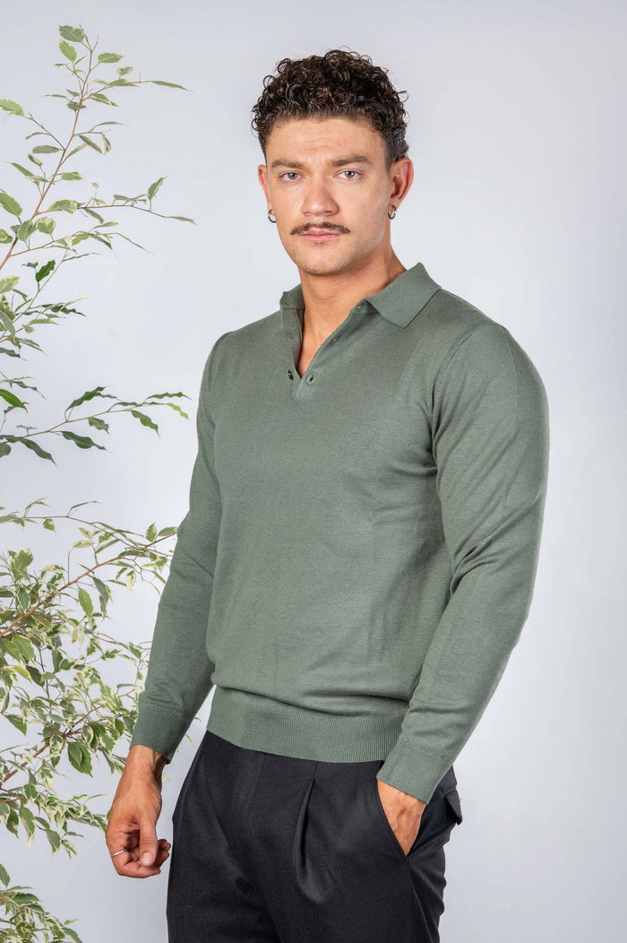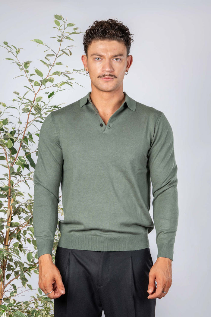 - Polo tinta unita in misto cashmere. Collo camicia con bottoni. Maniche lunghe con polsino elasticizzato. Fondo con bastonetto. Made in Italy.