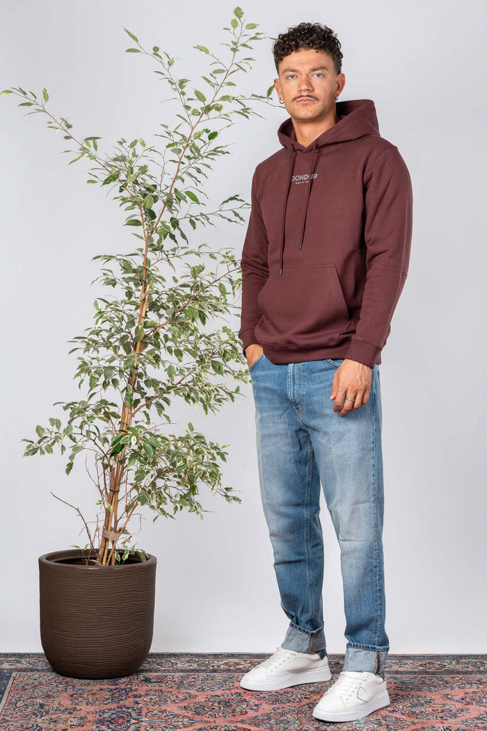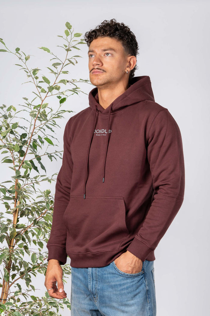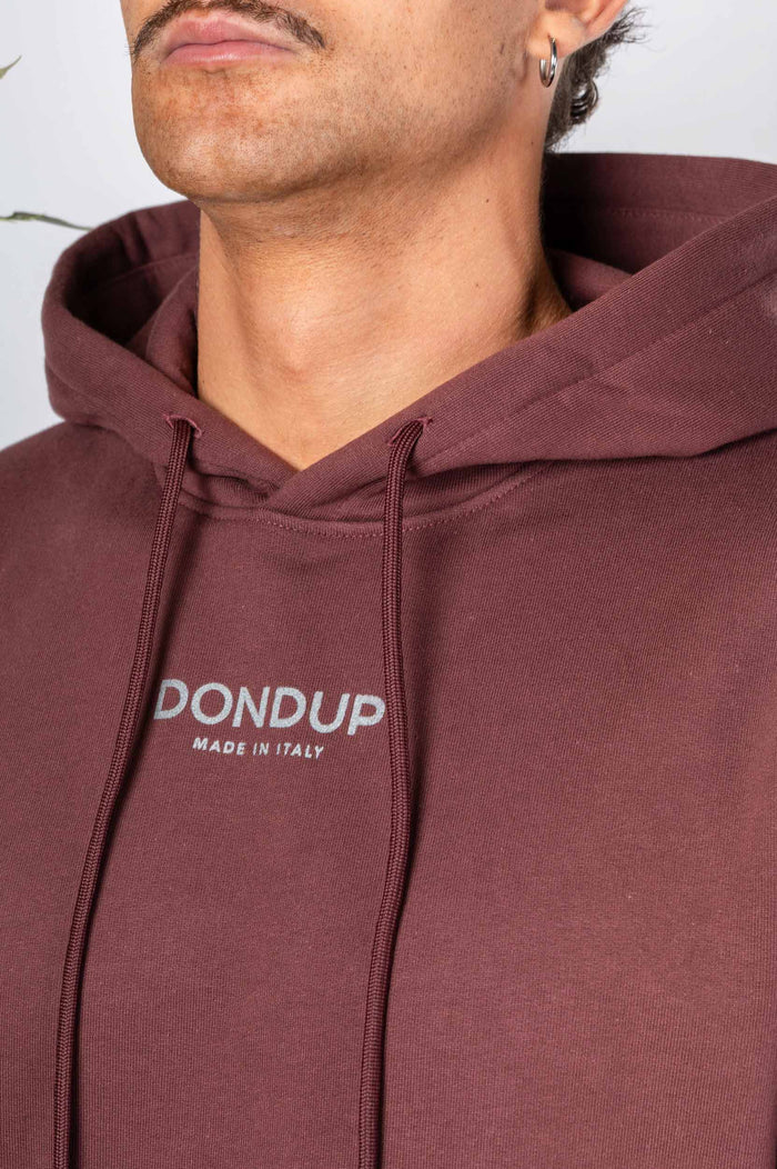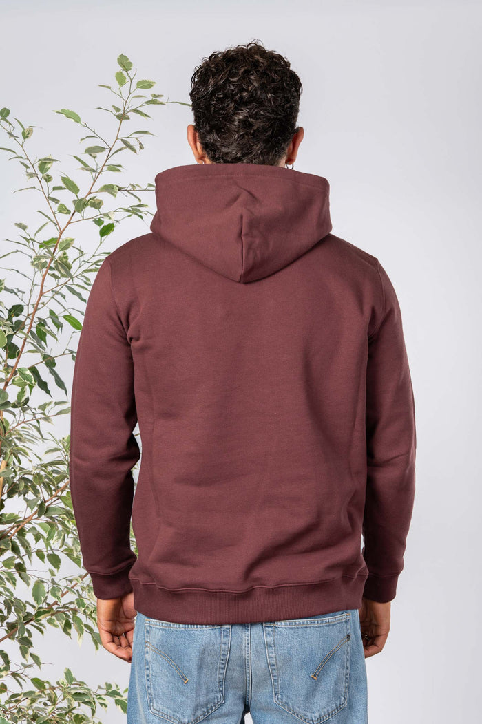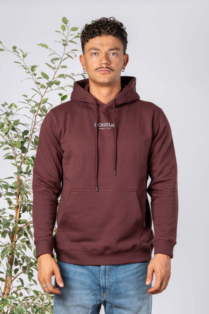 - Felpa cappuccio tinta unita in cotone. Girocollo e polsini canettati. Fondo bastonetto. Stampa logo sul petto.