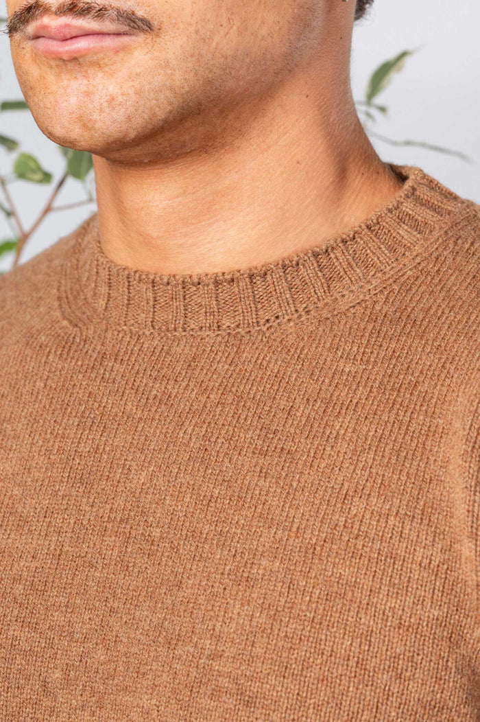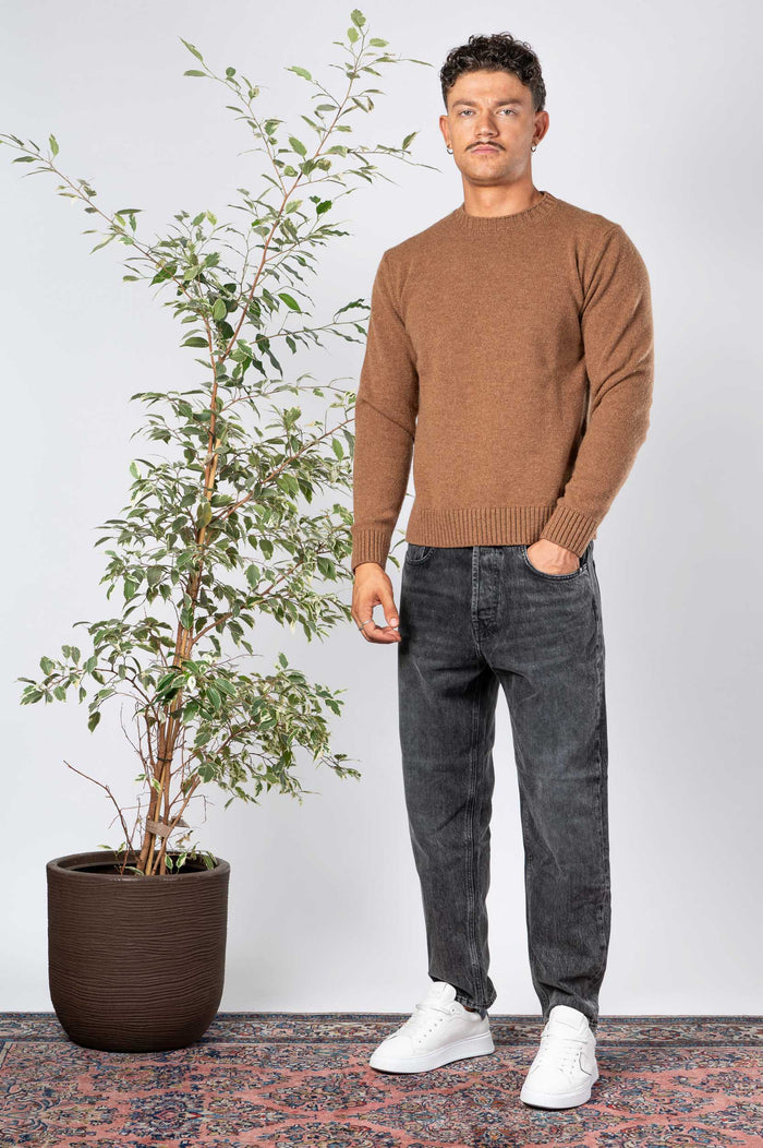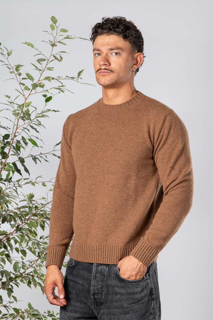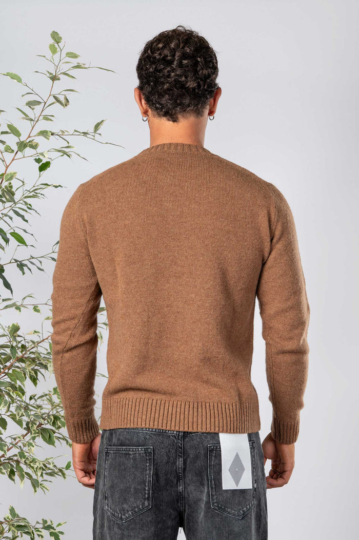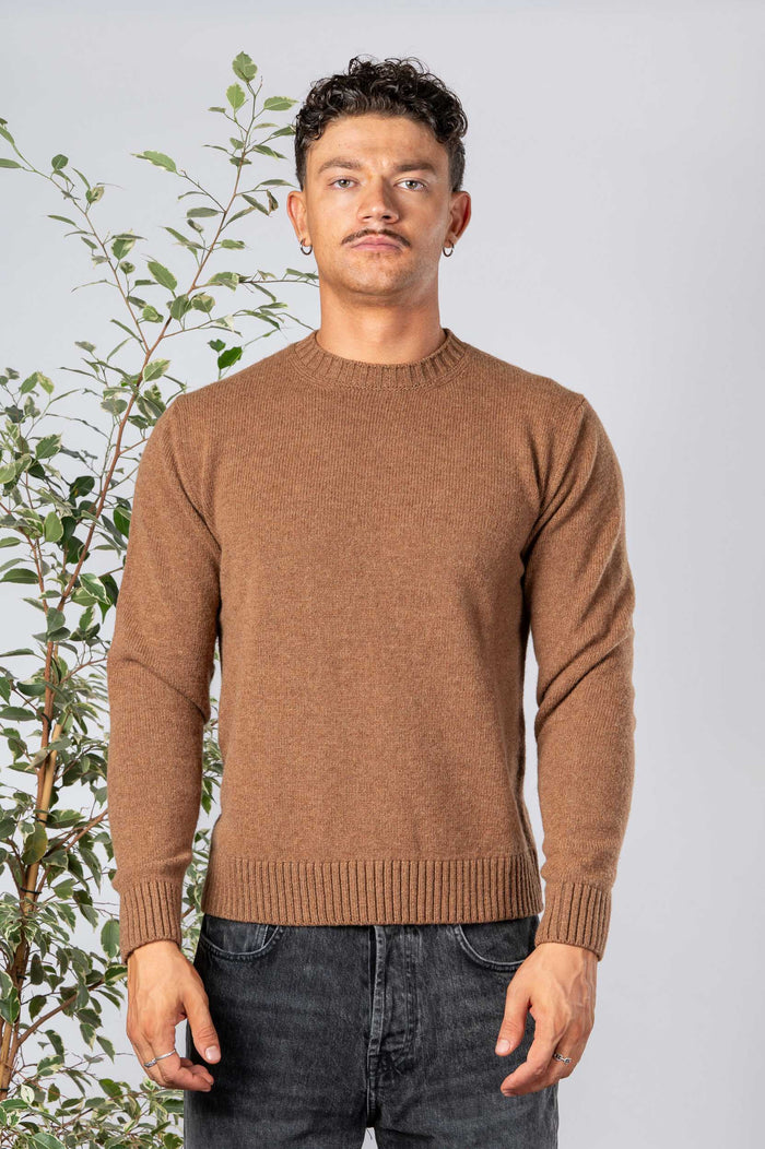• Girocollo tinta unita in lana. Collo elasticizzato. Polsini e fondo a bastonetto.