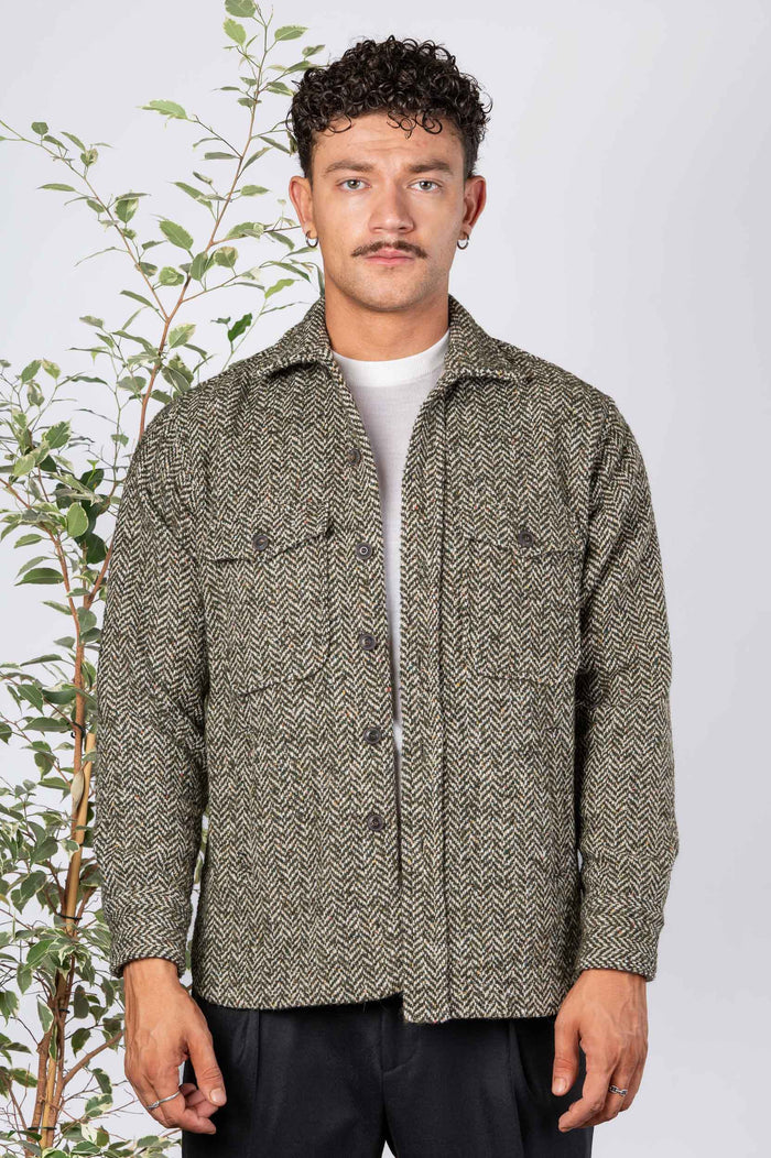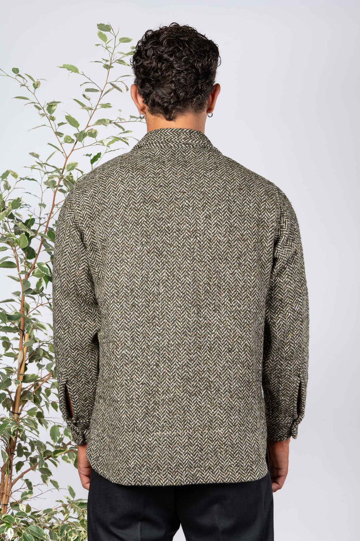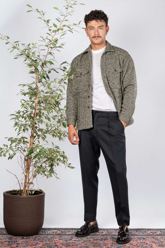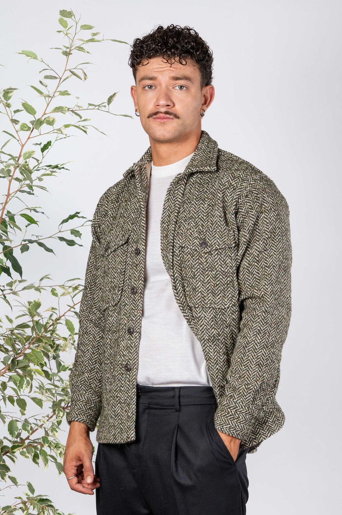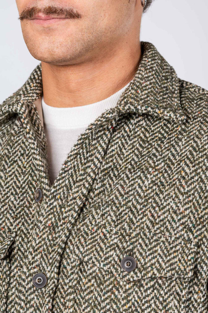 - Over Jacket spinata in misto lana. Chiusura frontale con bottoni in contrasto. Tasche sul petto. Fondo stondato. Polsini chiusura con bottoni.