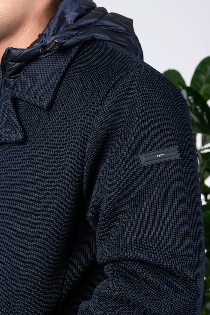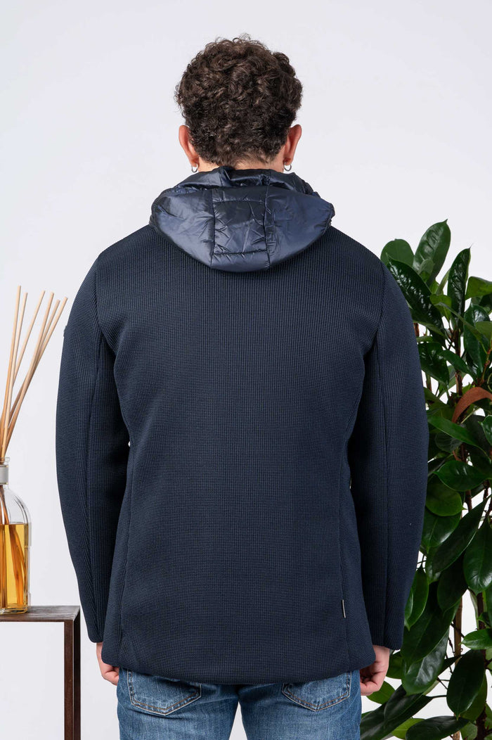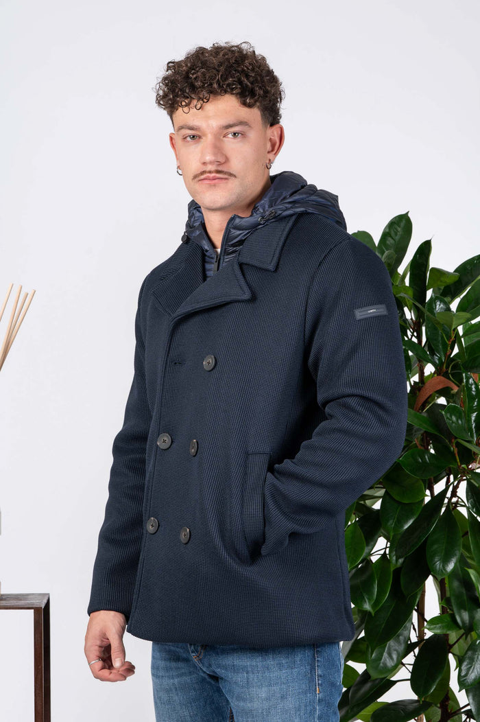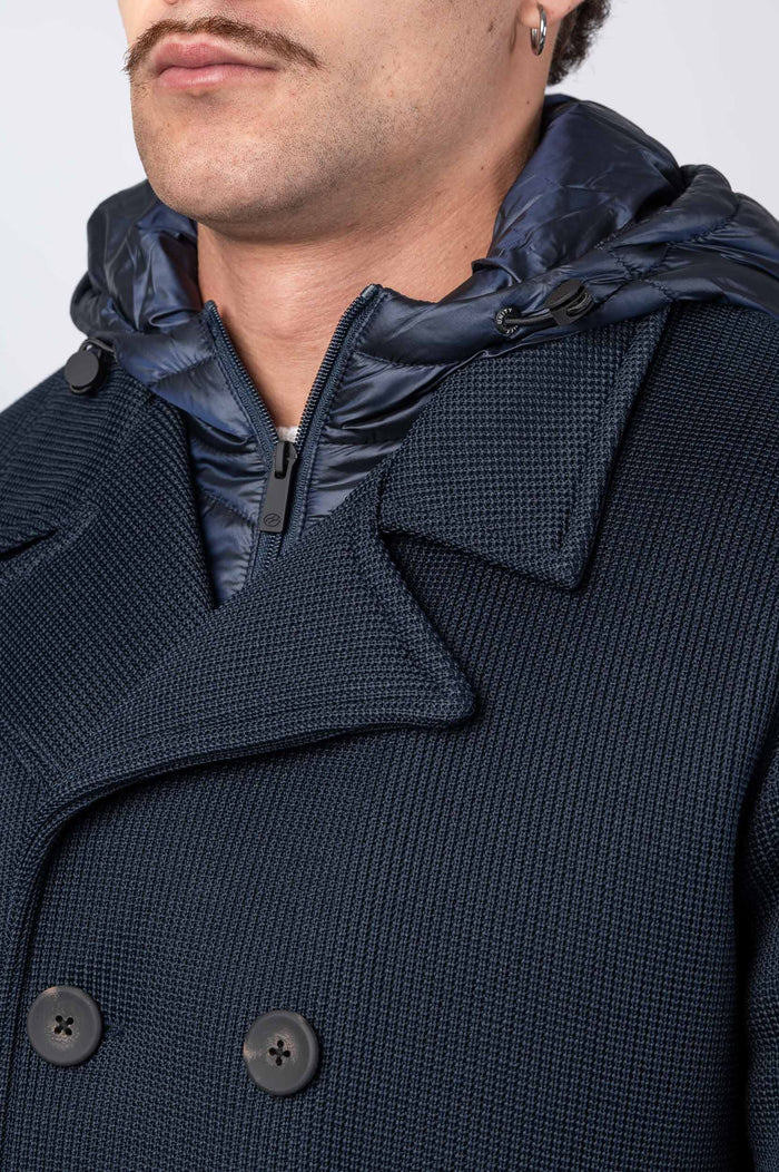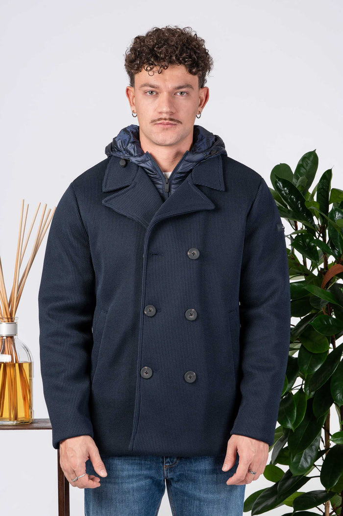 - Peacot doppio petto tinta unita con cappuccio in tessuto tecnico. Tasche a filo laterali. Chiusura con bottoni in contrasto.