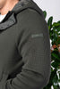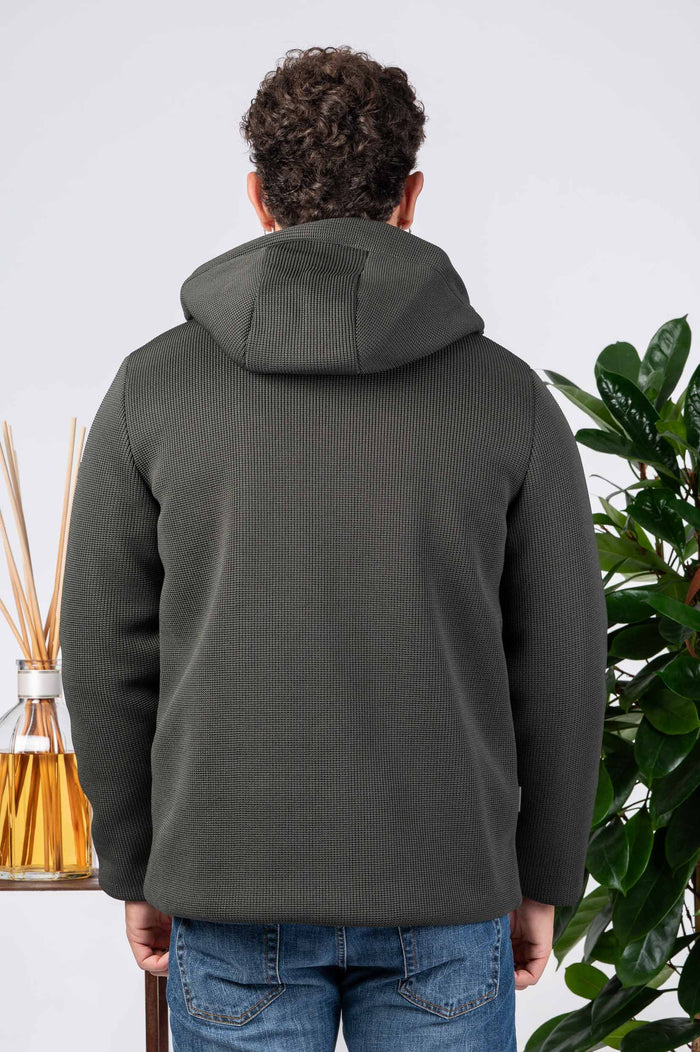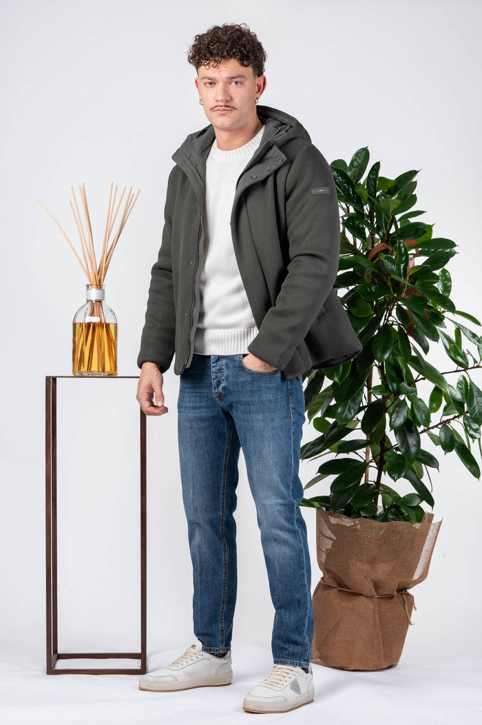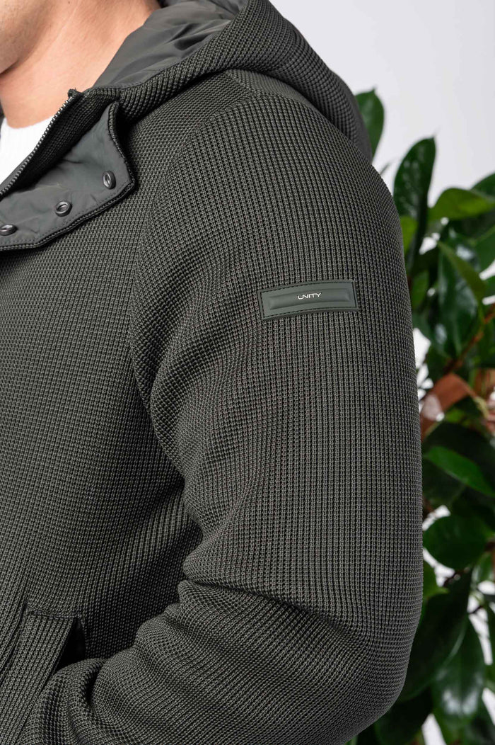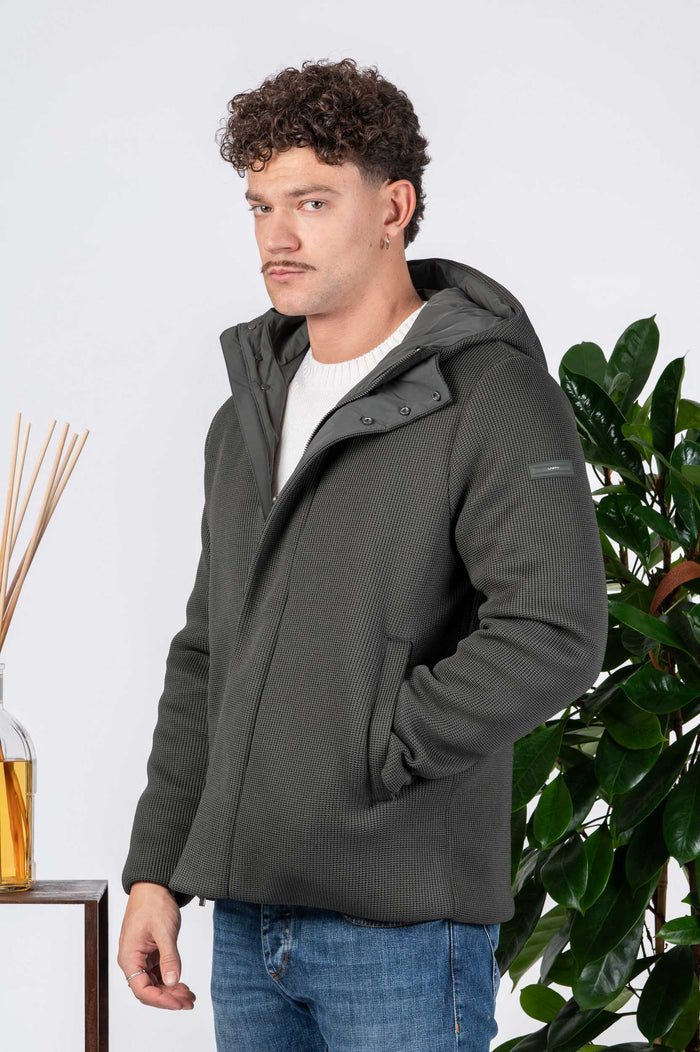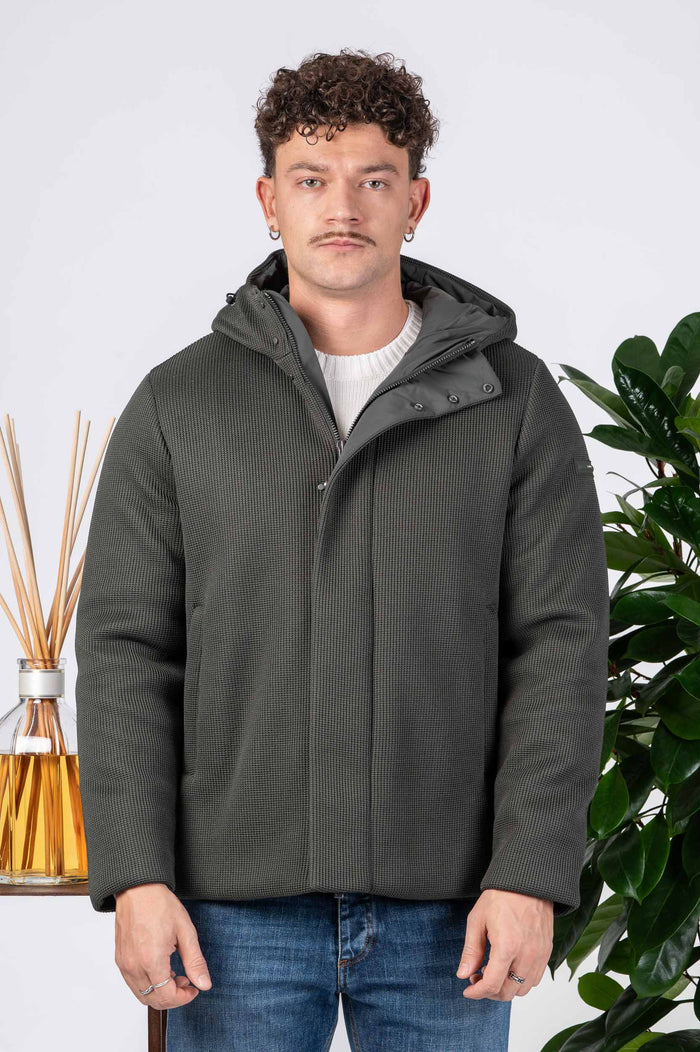 - Parka tinta unita con cappuccio in tessuto tecnico. Chiusura a scomparsa con zip in contrasto.