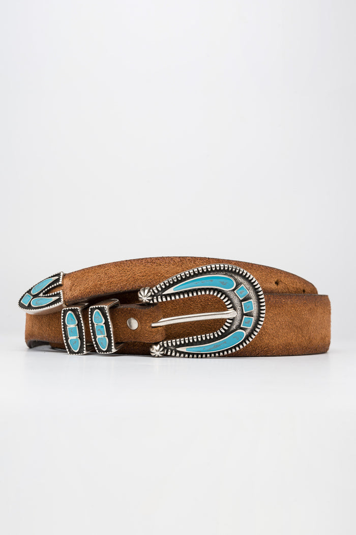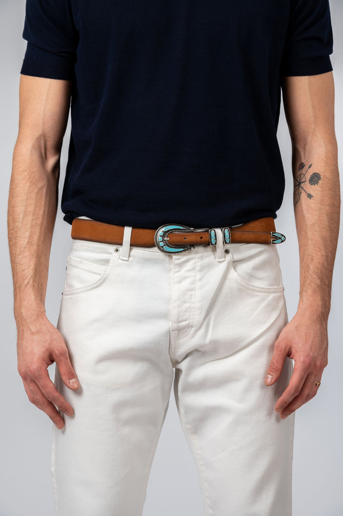 - Cintura in vera pelle effetto crosta vintage. Fibbia in metallo lavorata impreziosita da dettagli turchese con fori nella parte opposta. Ispirazione americana heritage. Cintura artigianale Made in italy.