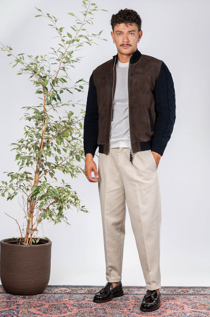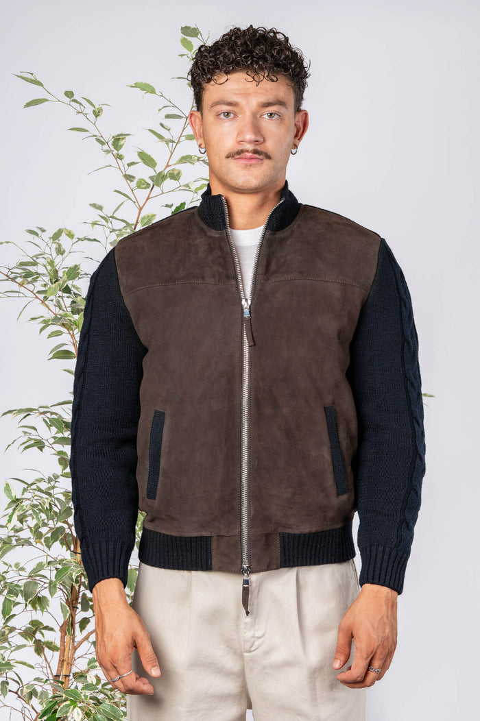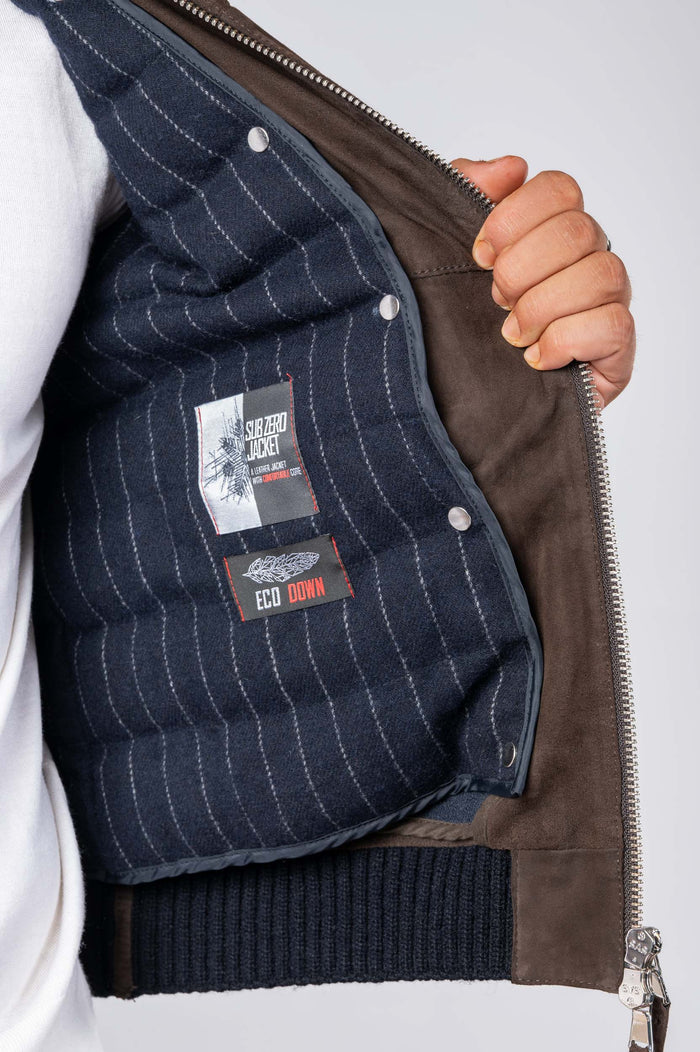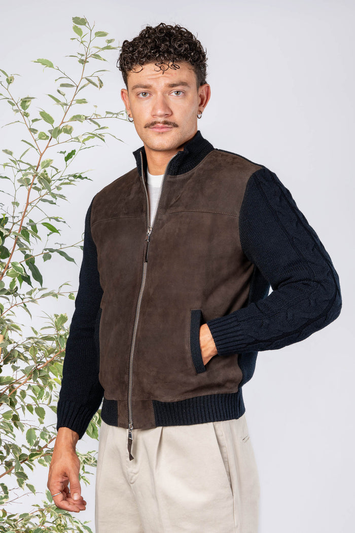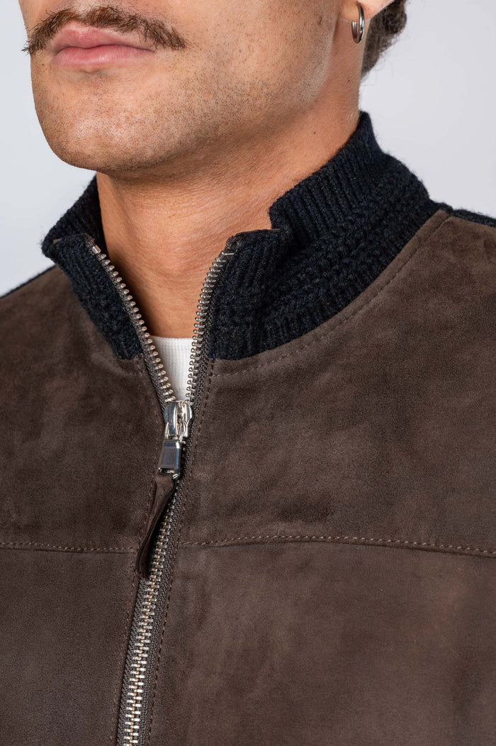 - Giubbino in pelle scamosciata. Chiusura frontale con zip in contrasto. Tasche a filo laterali chiusura zip. Maniche in lana. Polsini e fondo con bastonetto.