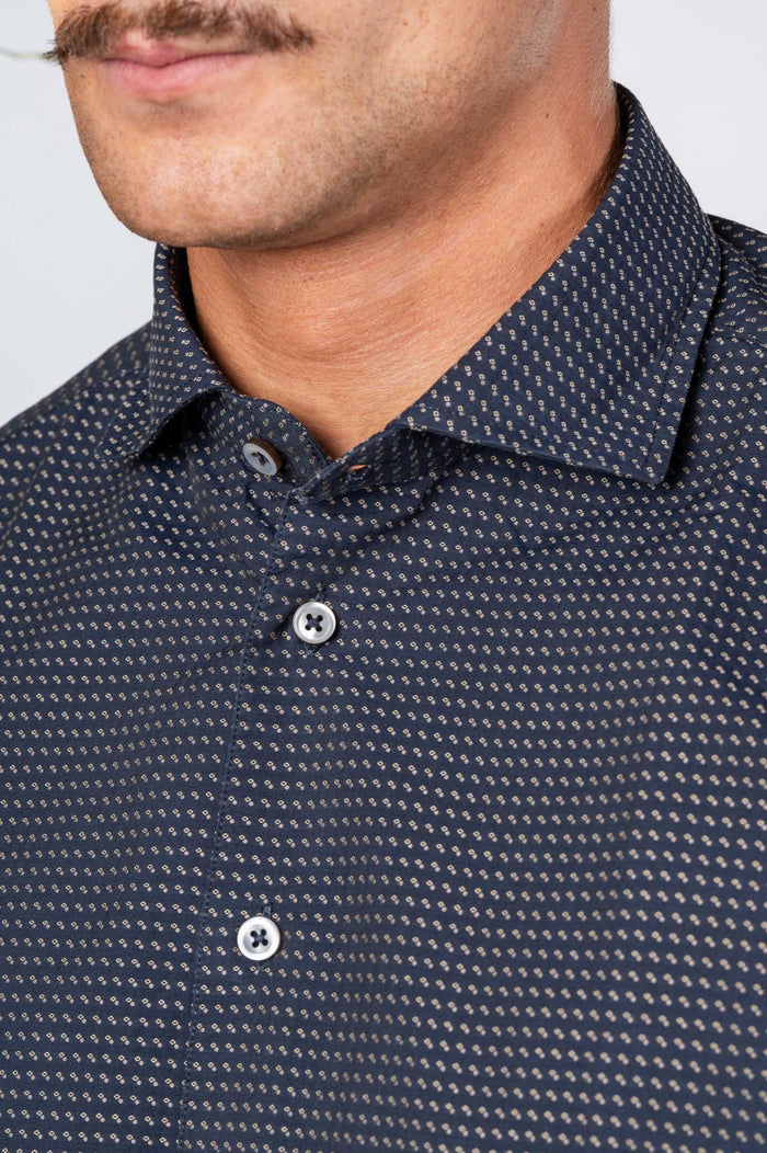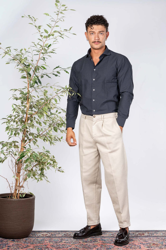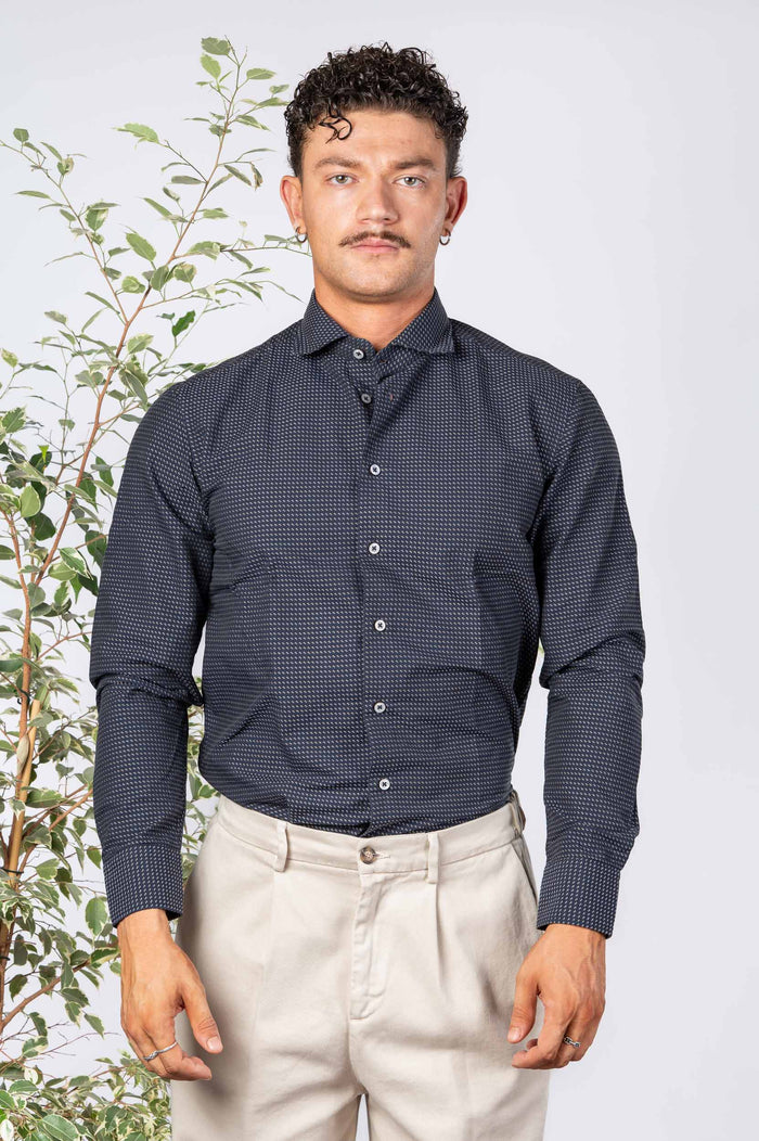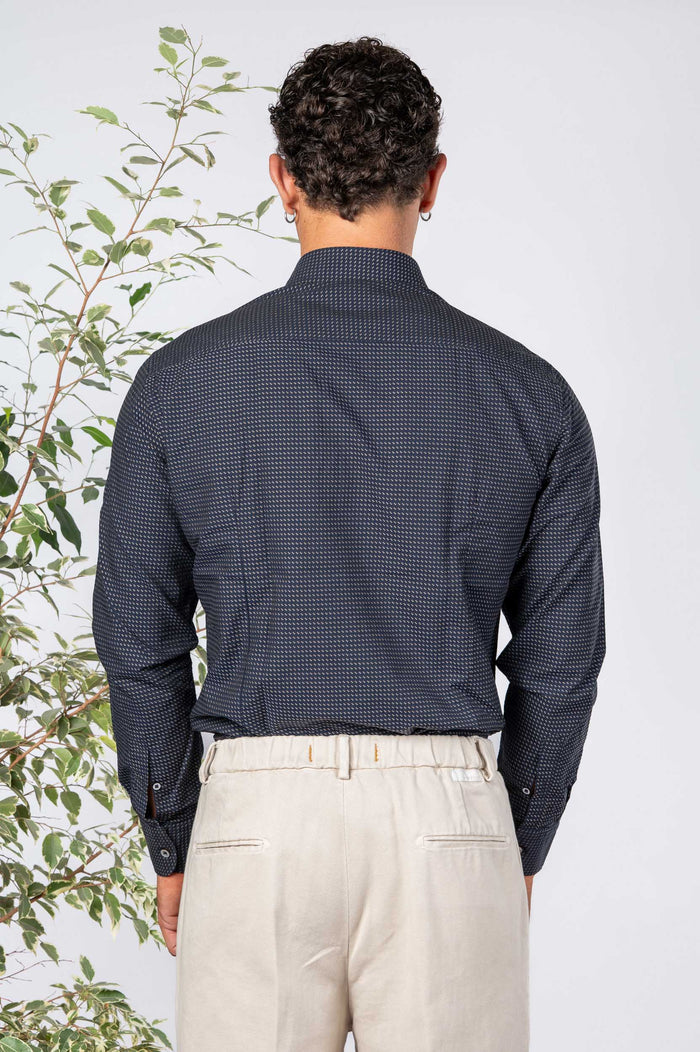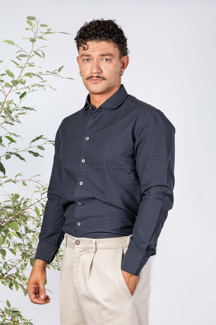 - Camicia fantasia in cotone. Chiusura frontale con bottoncini. Polsini con bottoncino. Fondo stondato.
