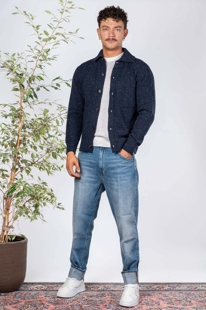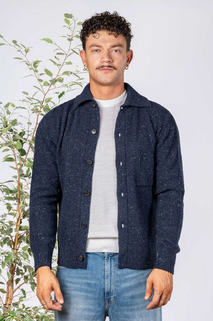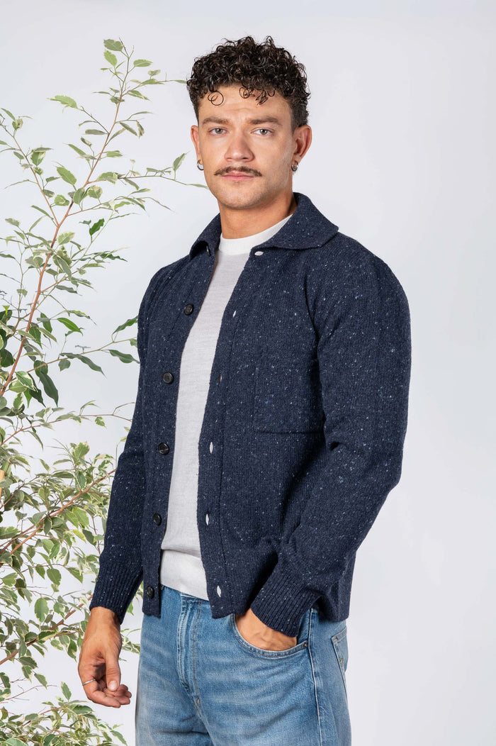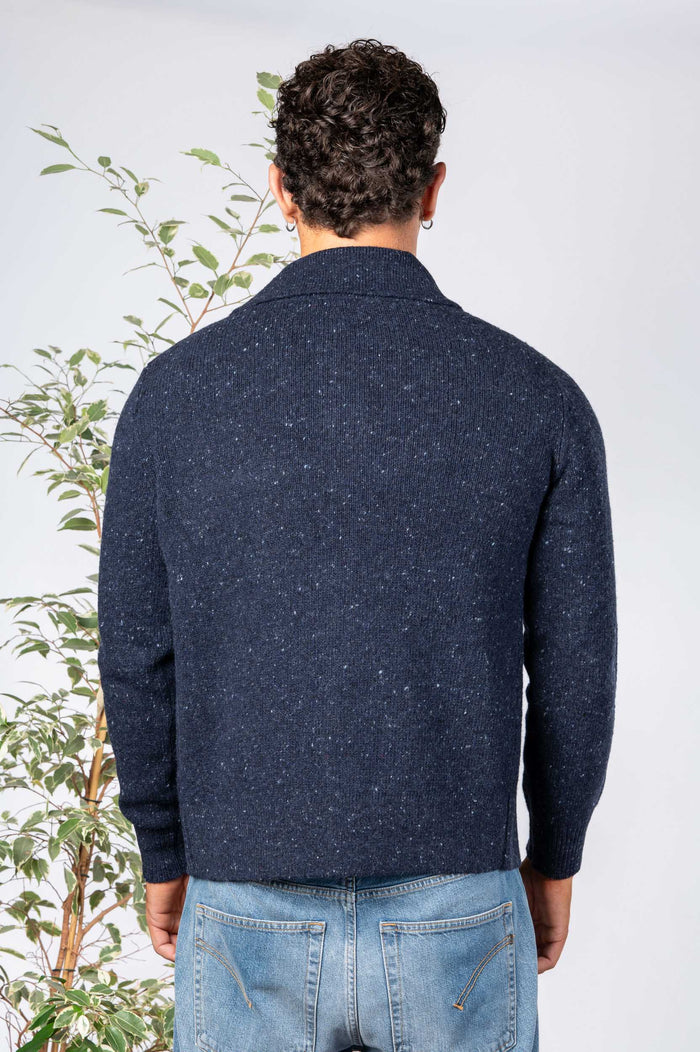 - Cardigan melange con colletto in misto lana. Taschino sul petto. Chiusura con bottoni in contrasto. Polsini canettati e elasticizzati.