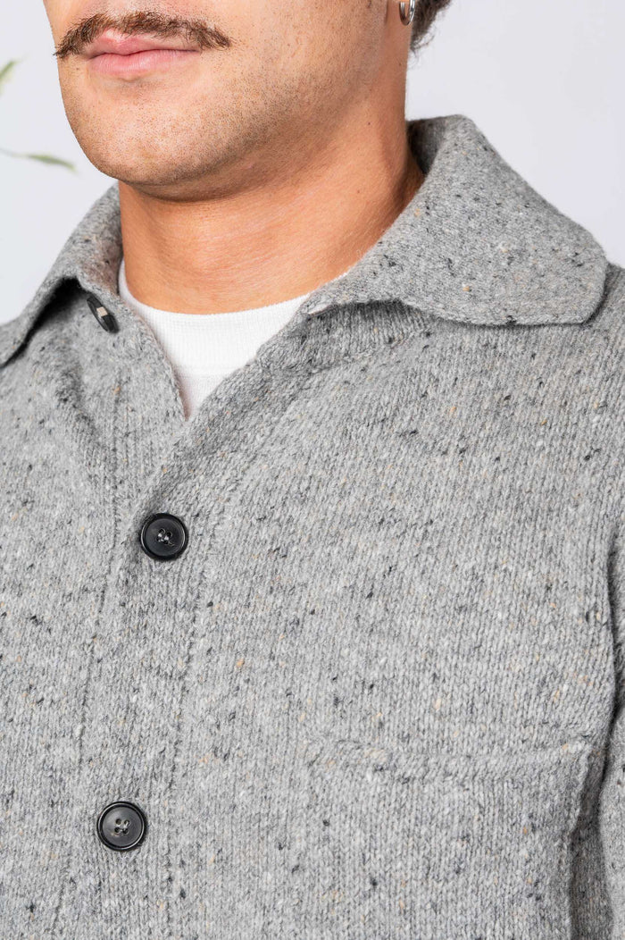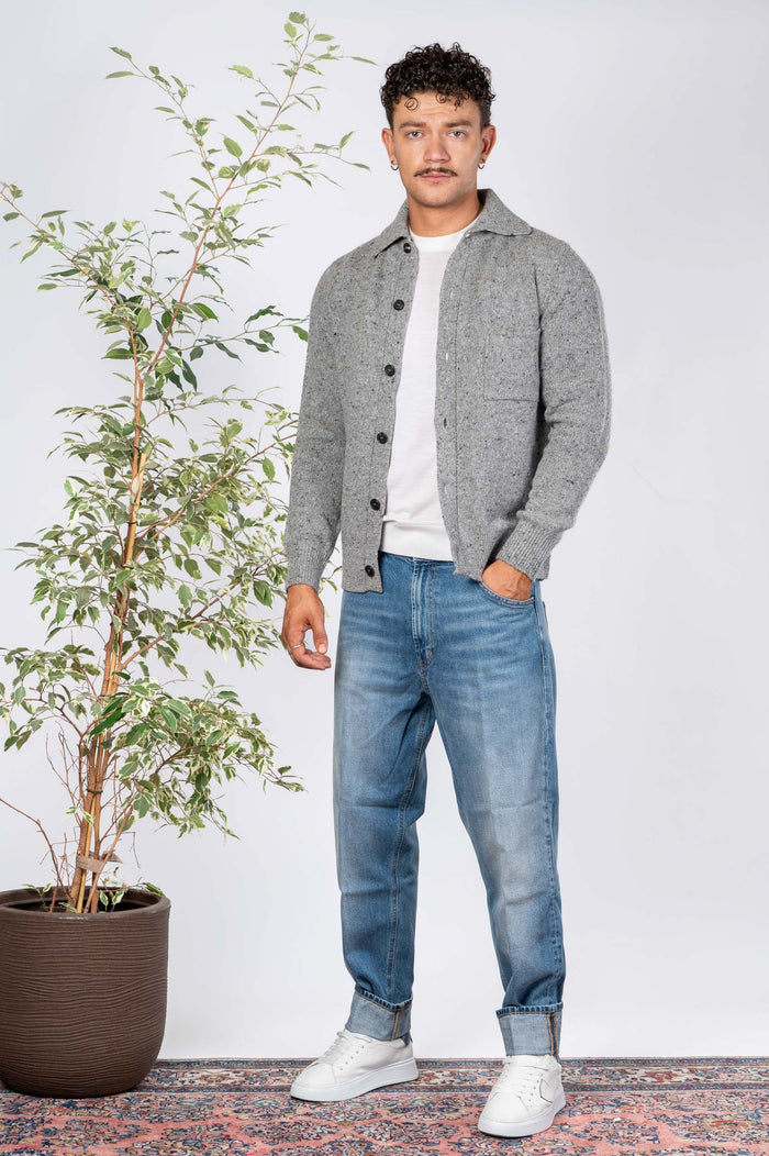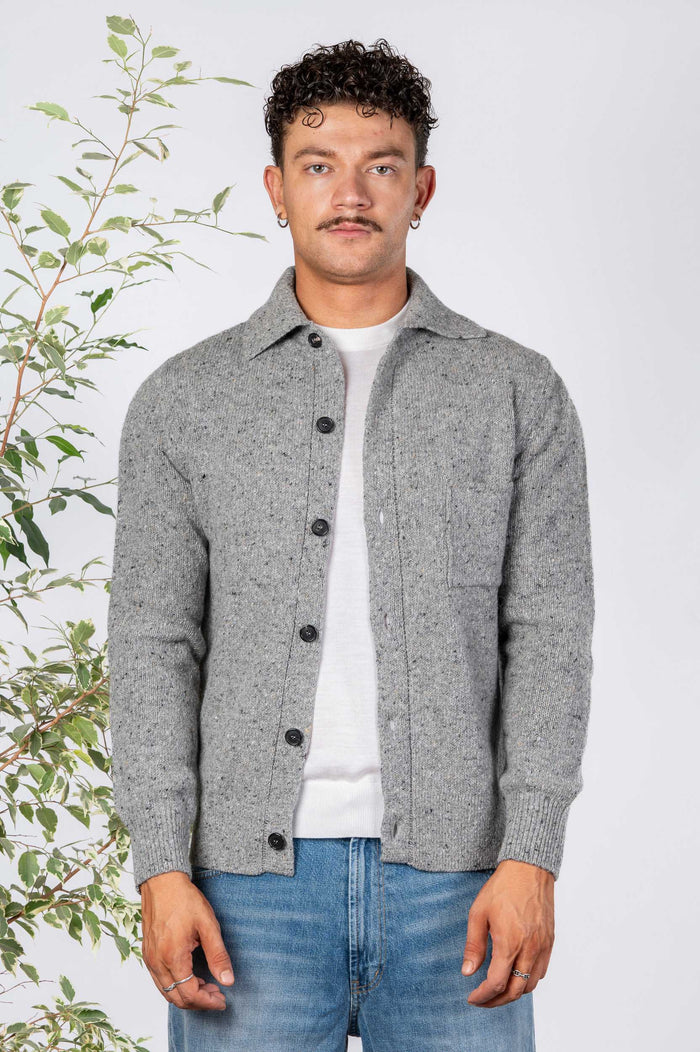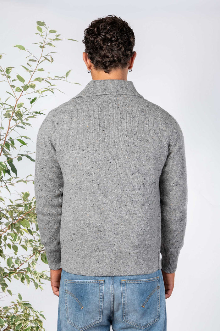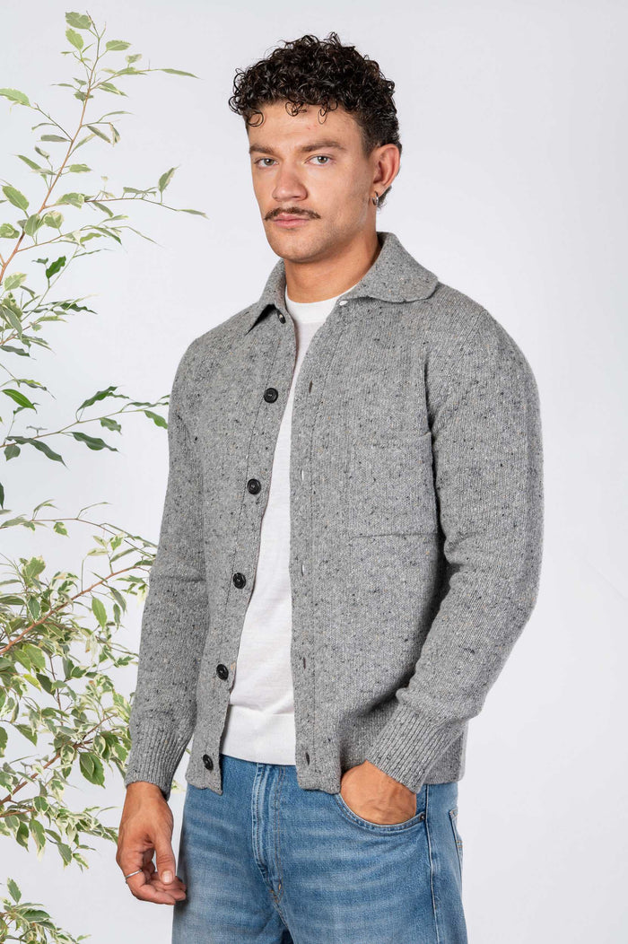 - Cardigan melange con colletto in misto lana. Taschino sul petto. Chiusura con bottoni in contrasto. Polsini canettati e elasticizzati.