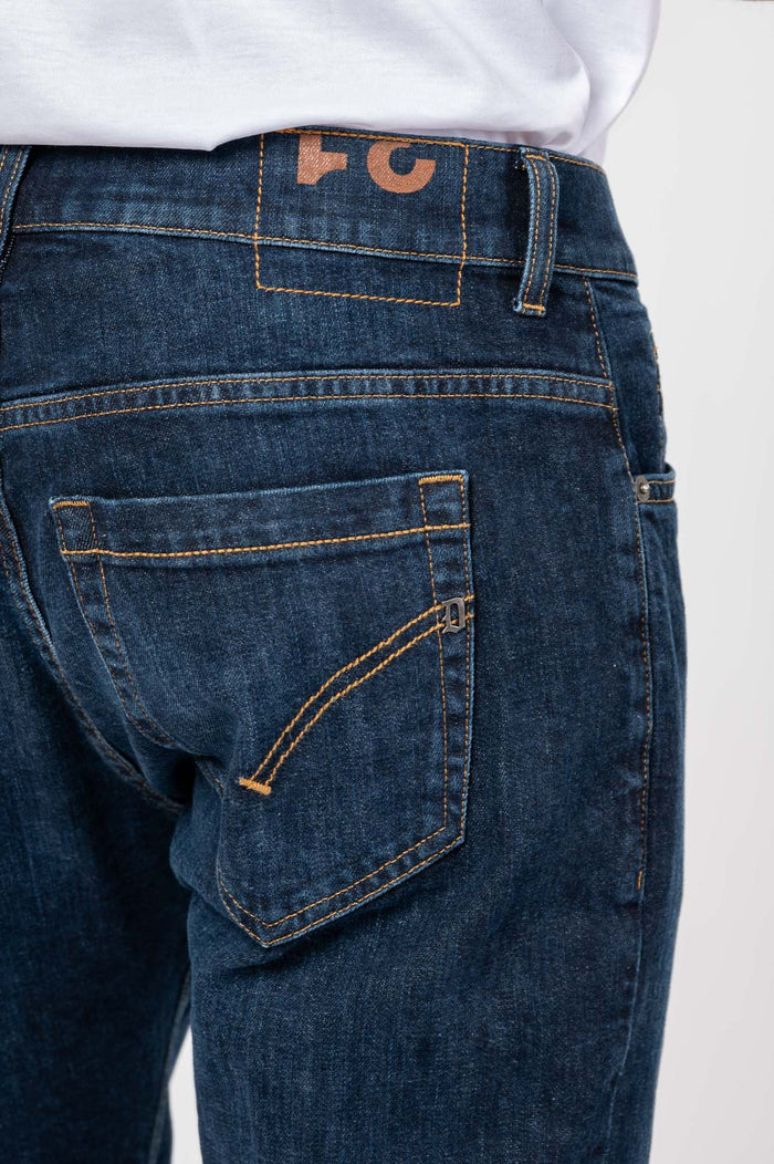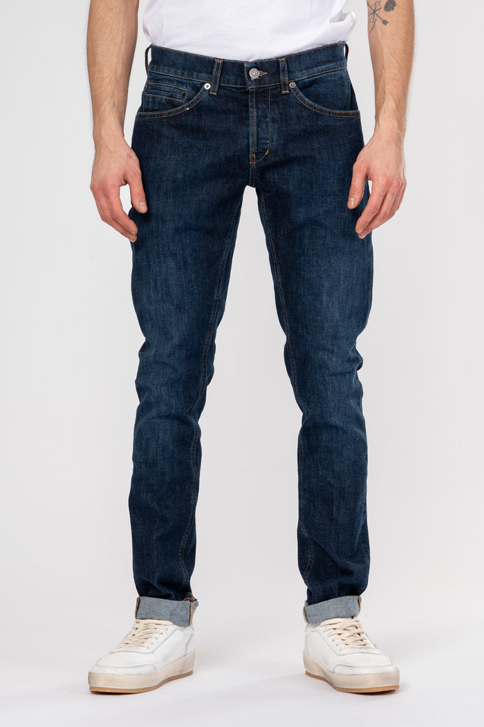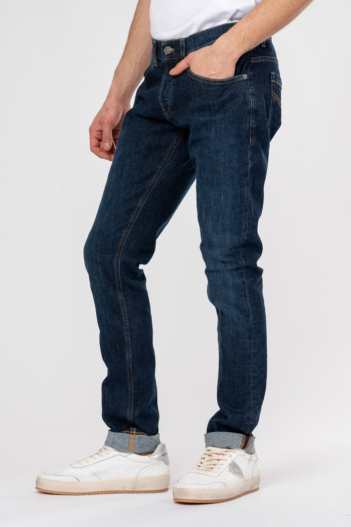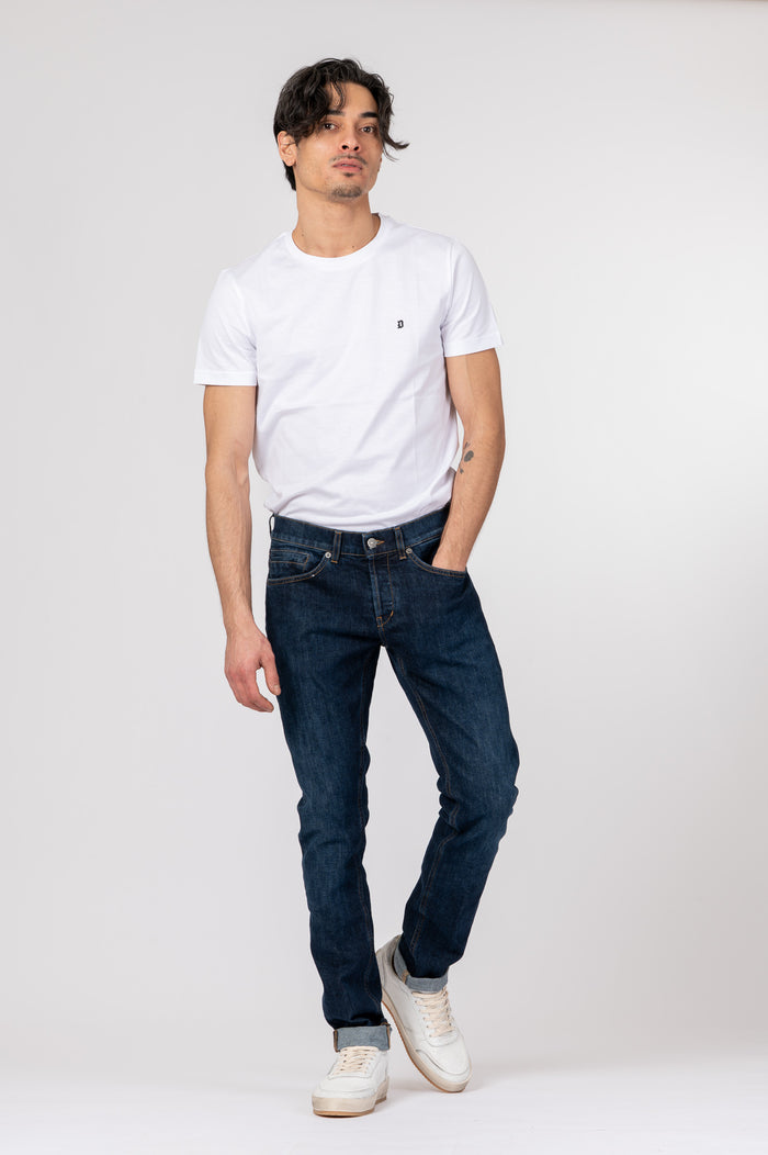 • Jeans in cotone elasticizzato tinta unita effetto lavato. Vita regolare. Cinque tasche e piccola borchia logo sulla tasca posteriore. Vestibilità slim con fondo stretto.