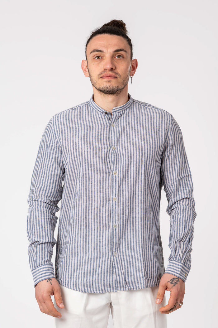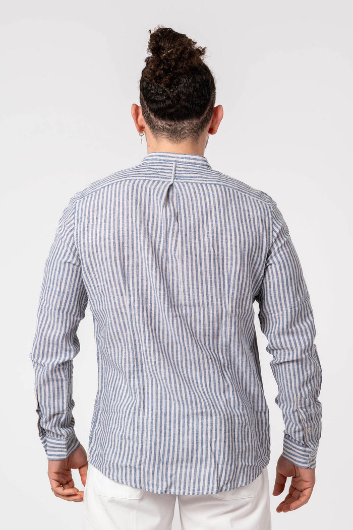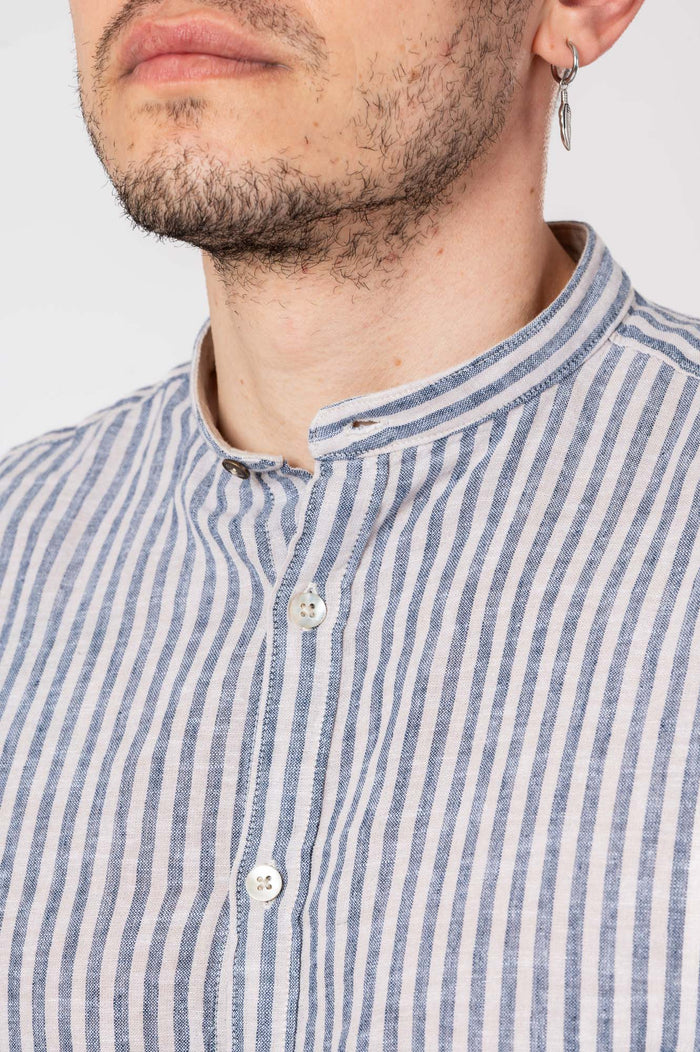 • Camicia coreana rigata in cotone e lino. Chiusura frontale con bottoni. Polsini con bottoni. Fondo stondato.