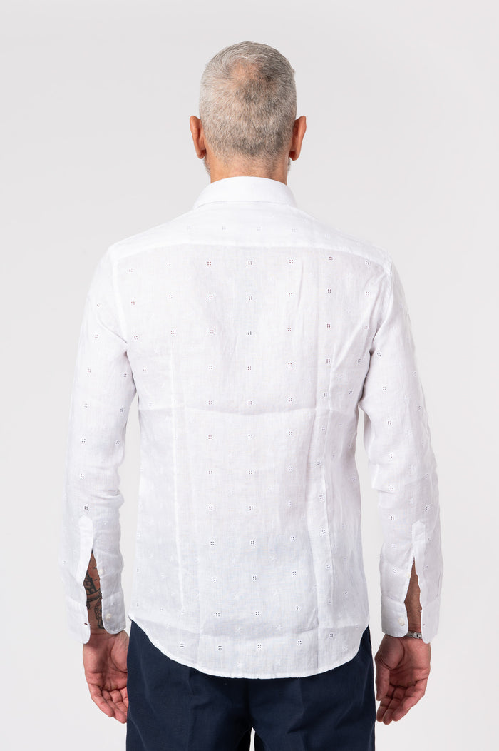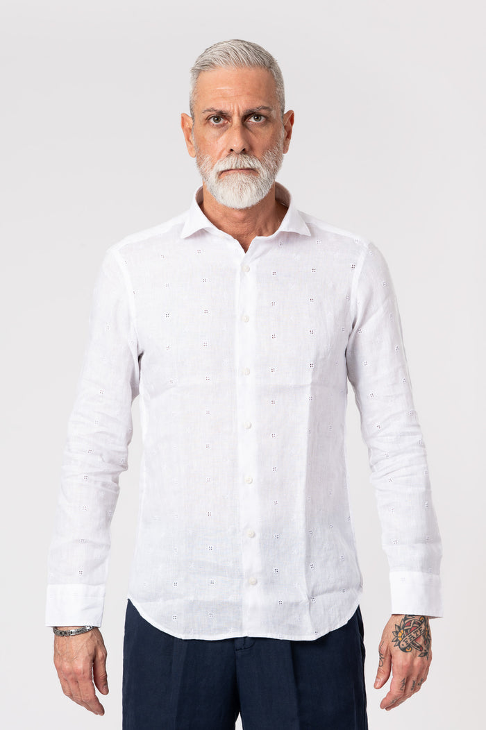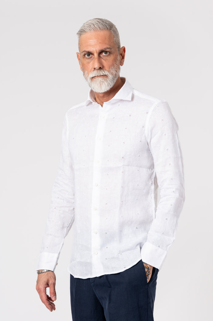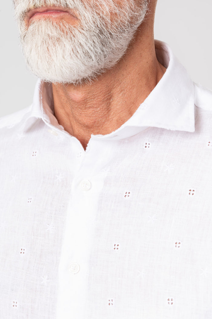 - Camicia tinta unita ricamata in cotone. Chiusura frontale con bottoncini. Polsini con bottoncino. Fondo stondato.