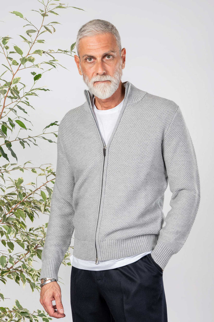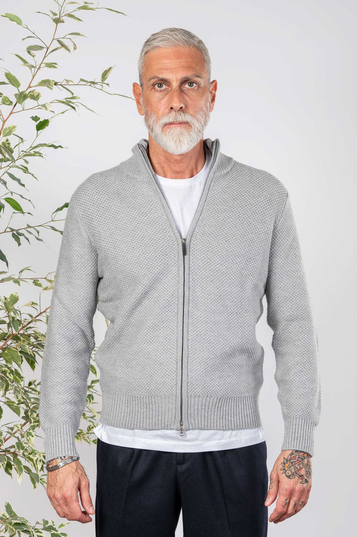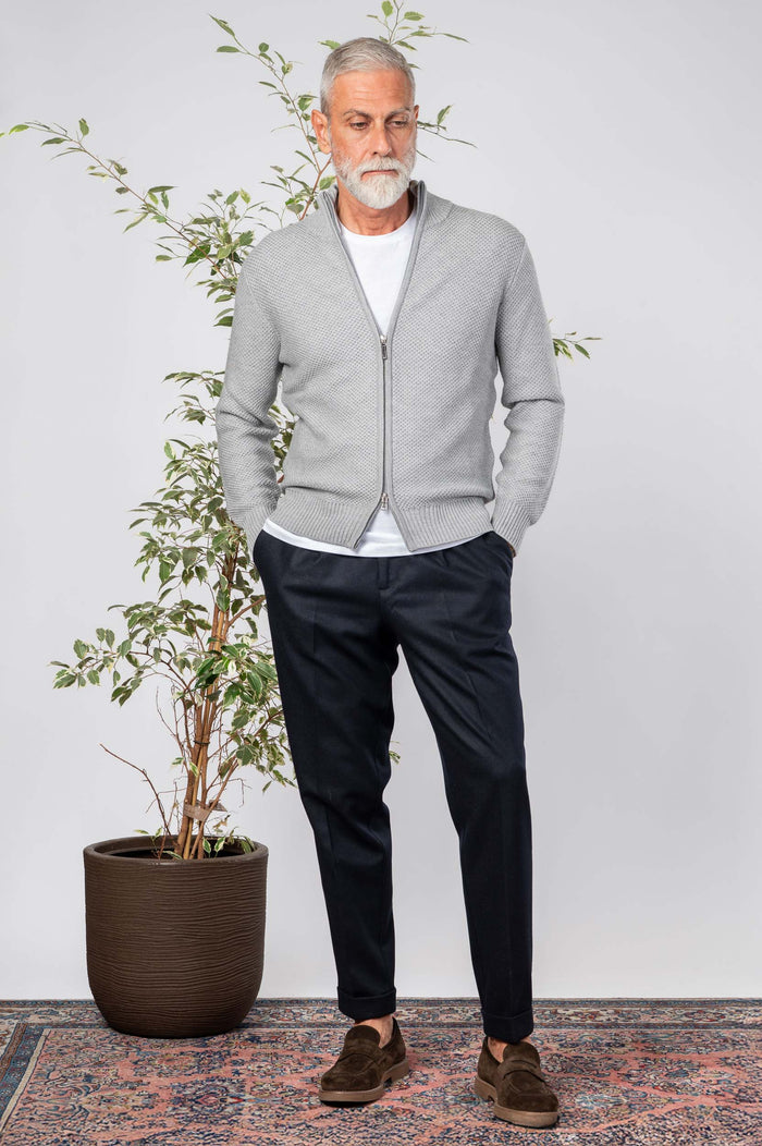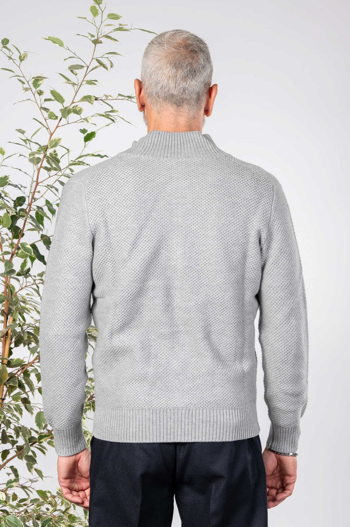 • Maglia zip in misto lana-cotone. Polsini canettati. Fondo con bastonetto. Chiusura con zip in contrasto.