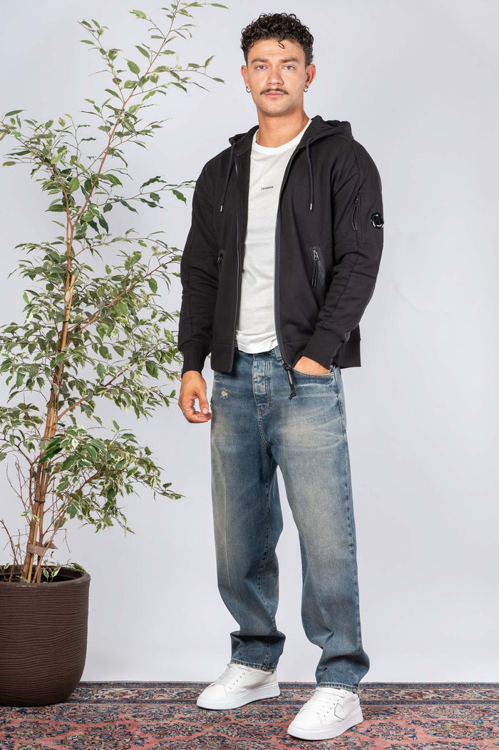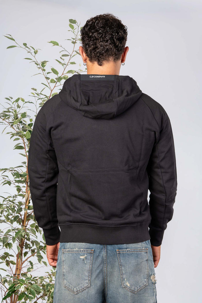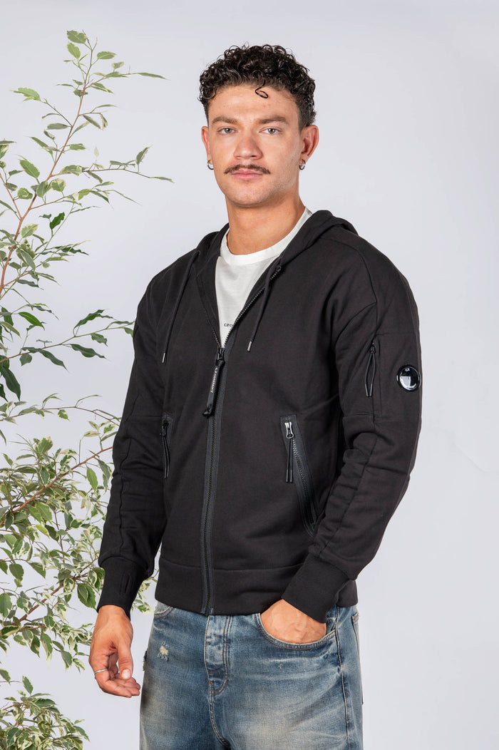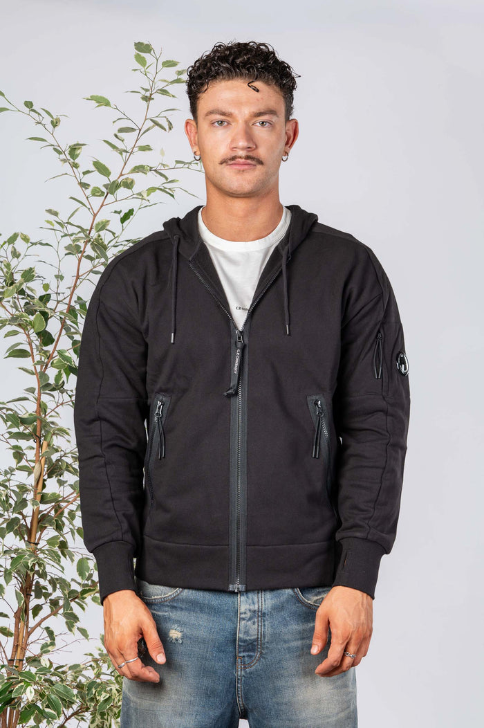 - Felpa cappuccio tinta unita in cotone. Polsini elasticizzati e fondo bastonetto. Chiusura a zip e tasche frontali con zip. Taschino sul braccio con logo iconico.