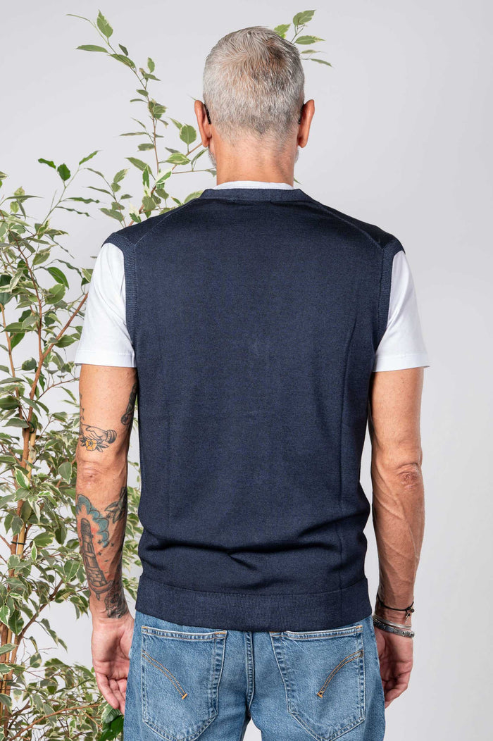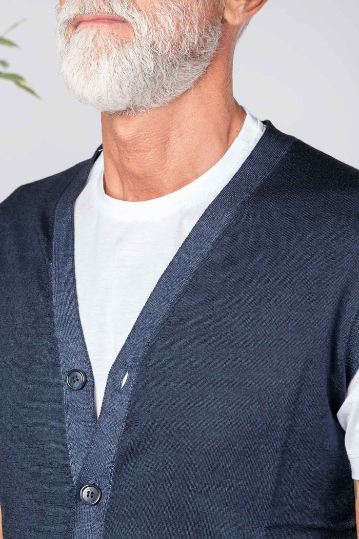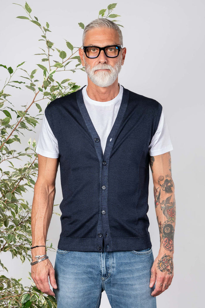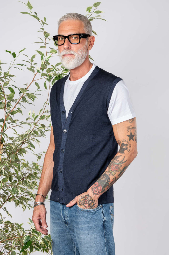 • Gilet 100% Lana merino tinta unita. Chiusura frontale con bottoni in contrasto. Fondo con bastonetto.