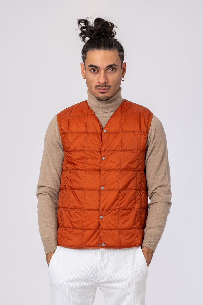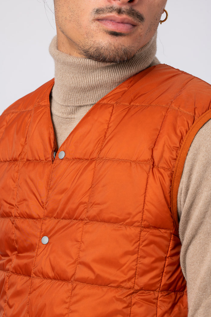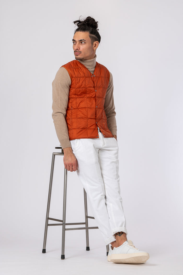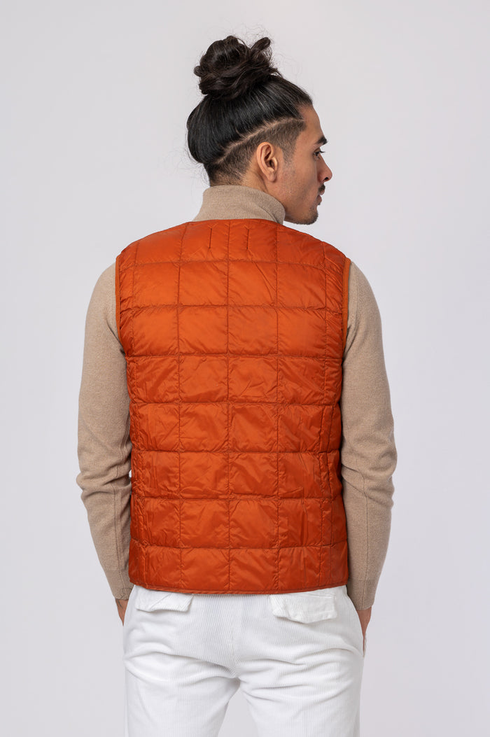 • Gilet tinta unita con scollo a V . Imbottitura 100% vera piuma d'oca. Chiusura frontale con bottoni automatici . Tasche laterali con chiusura a zip. Fornita con custodia .