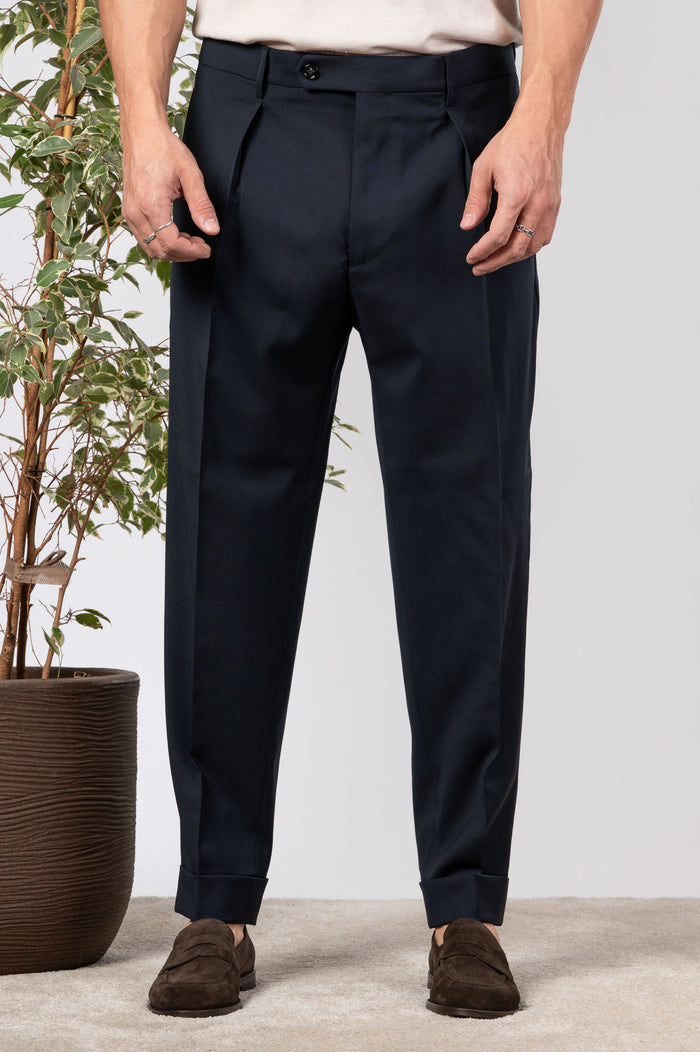 - Pantalone tinta unita in lana . Vita alta, con pinces ,coscia comoda, fondo leggermente più stretto. Tasche a filo frontali, tasche retro a filo .