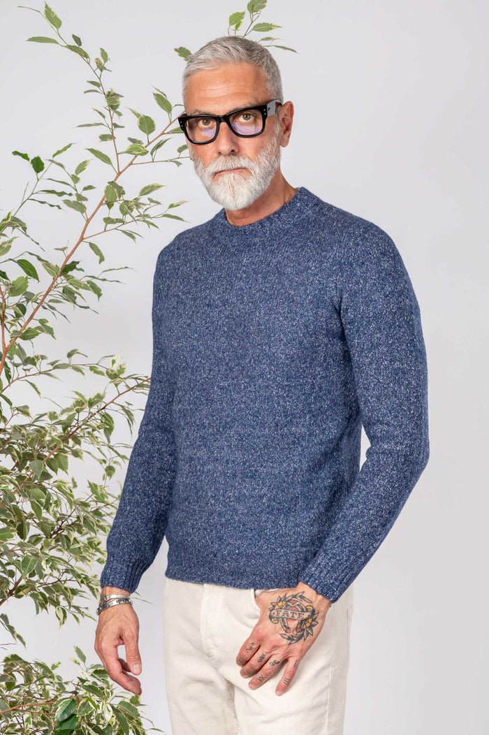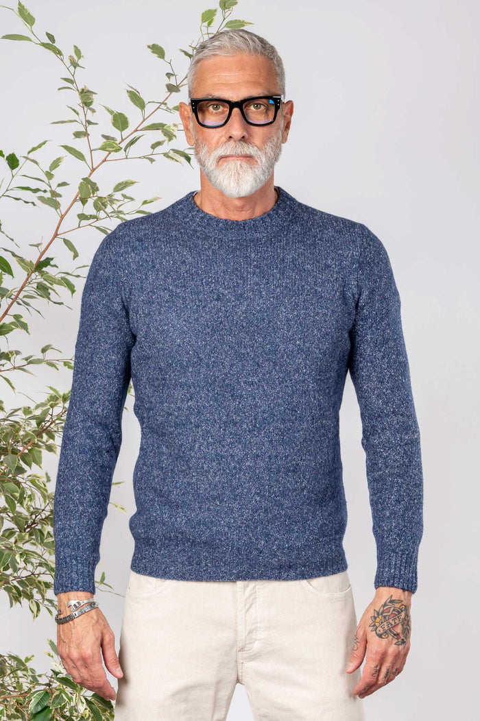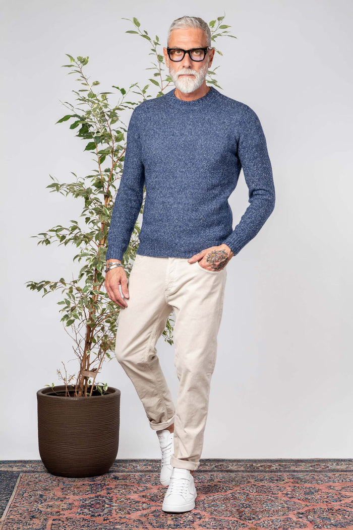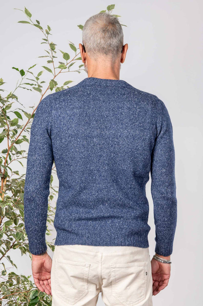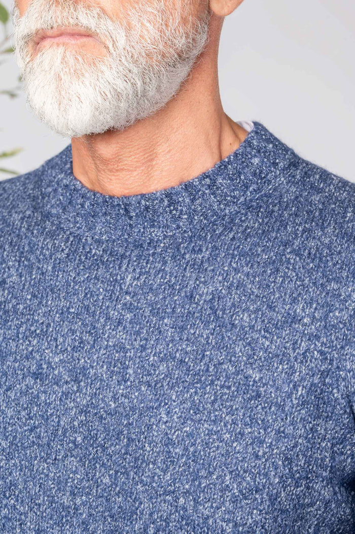 - Maglione girocollo in misto lana. Collo e polsini canettati. Fondo con bastonetto.