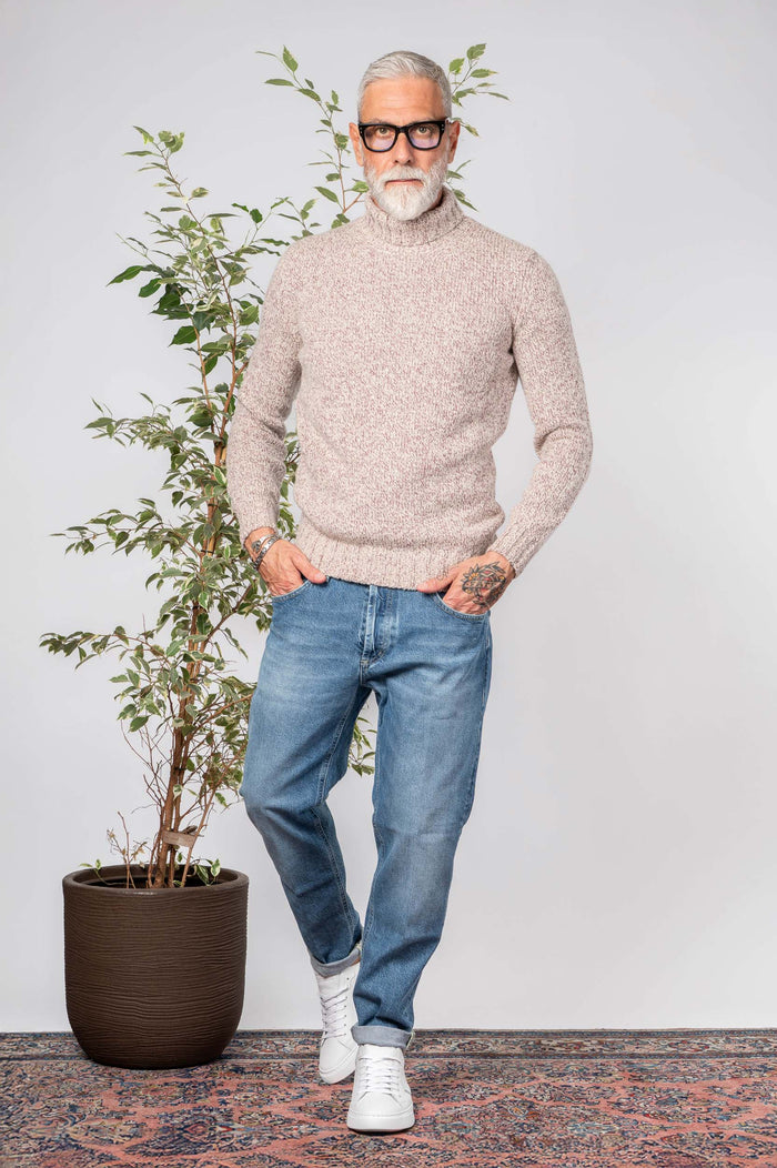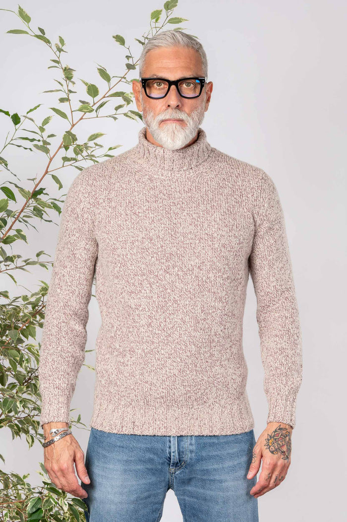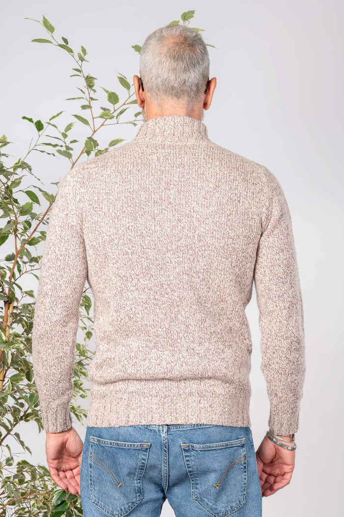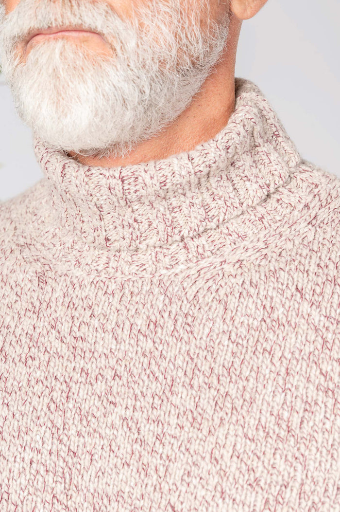 - Maglione dolcevita in misto lana. Collo e polsini canettati. Fondo con bastonetto.