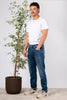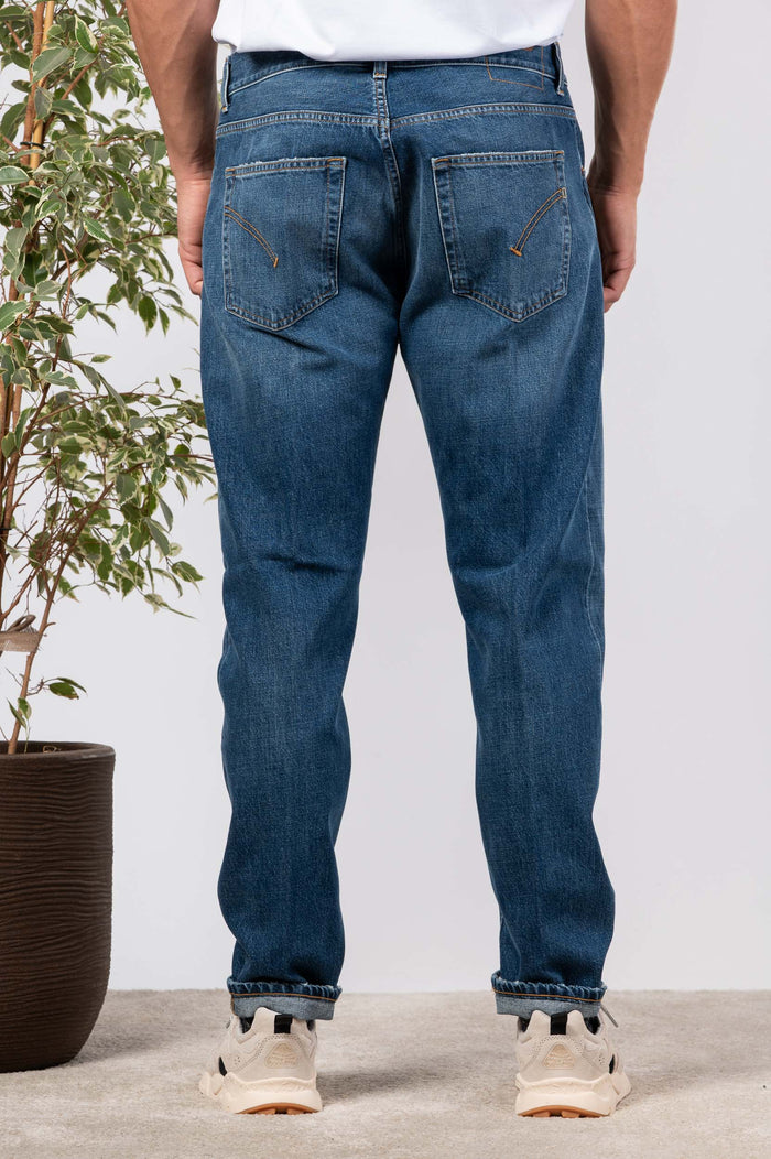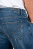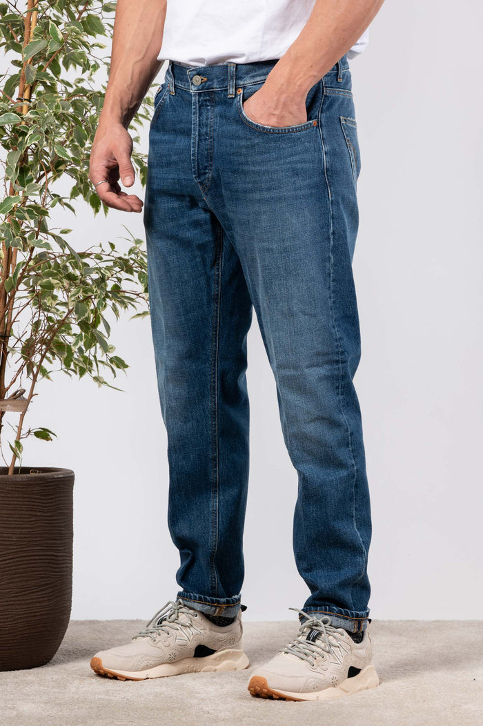 • Jeans in cotone elasticizzato tinta unita effetto lavato. Vita regolare. Cinque tasche e piccola borchia logo sulla tasca posteriore. Vestibilità regolare con fondo stretto.