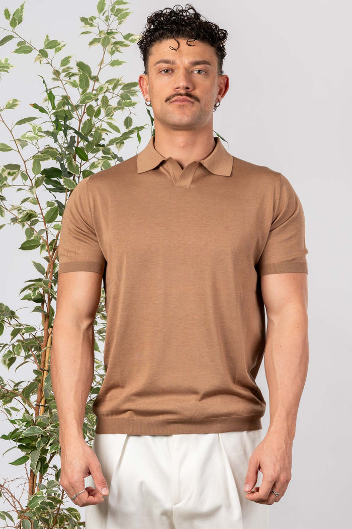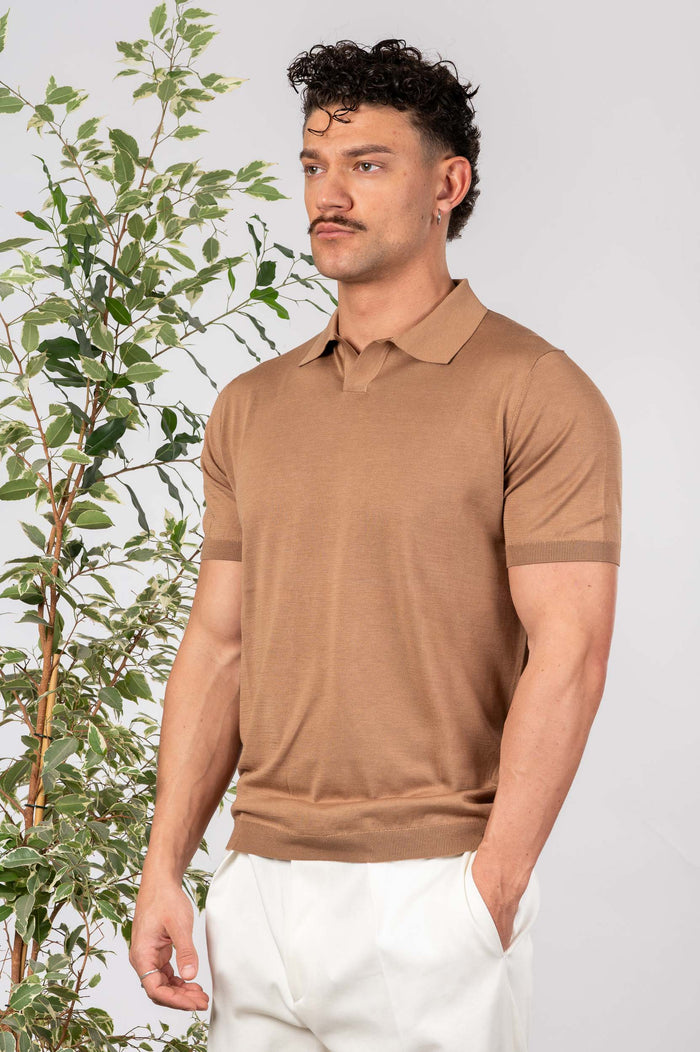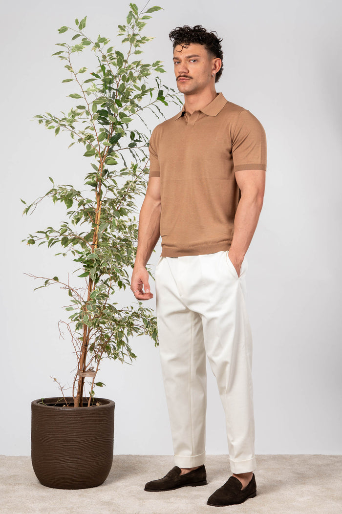 • Polo in seta e cotone tinta unita, maniche e fondo con bastonetto elasticizzato.
