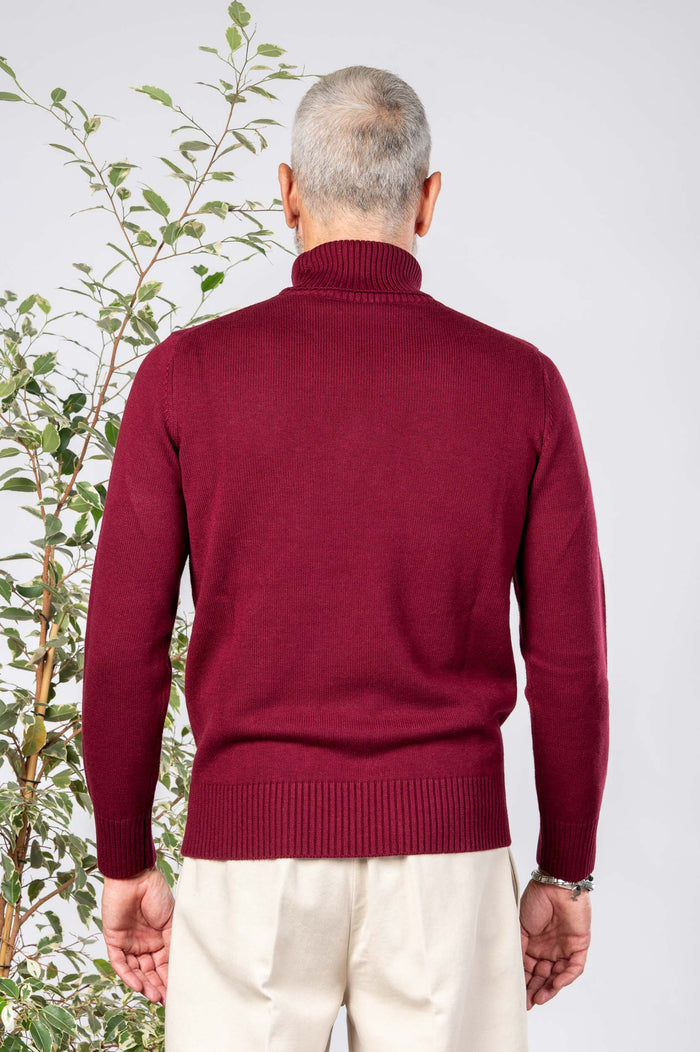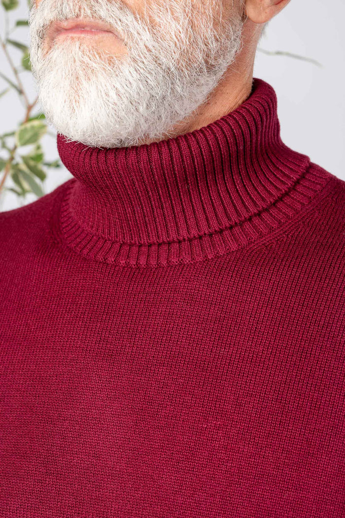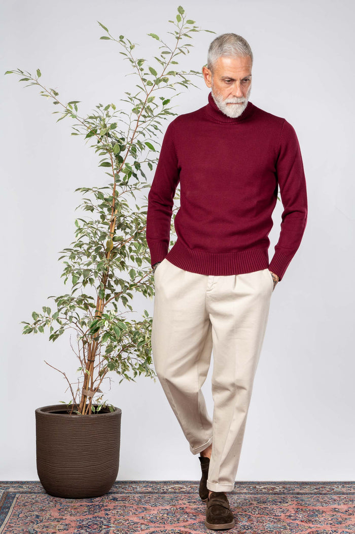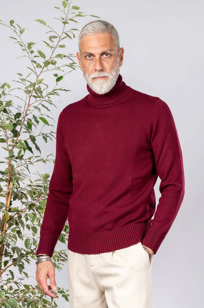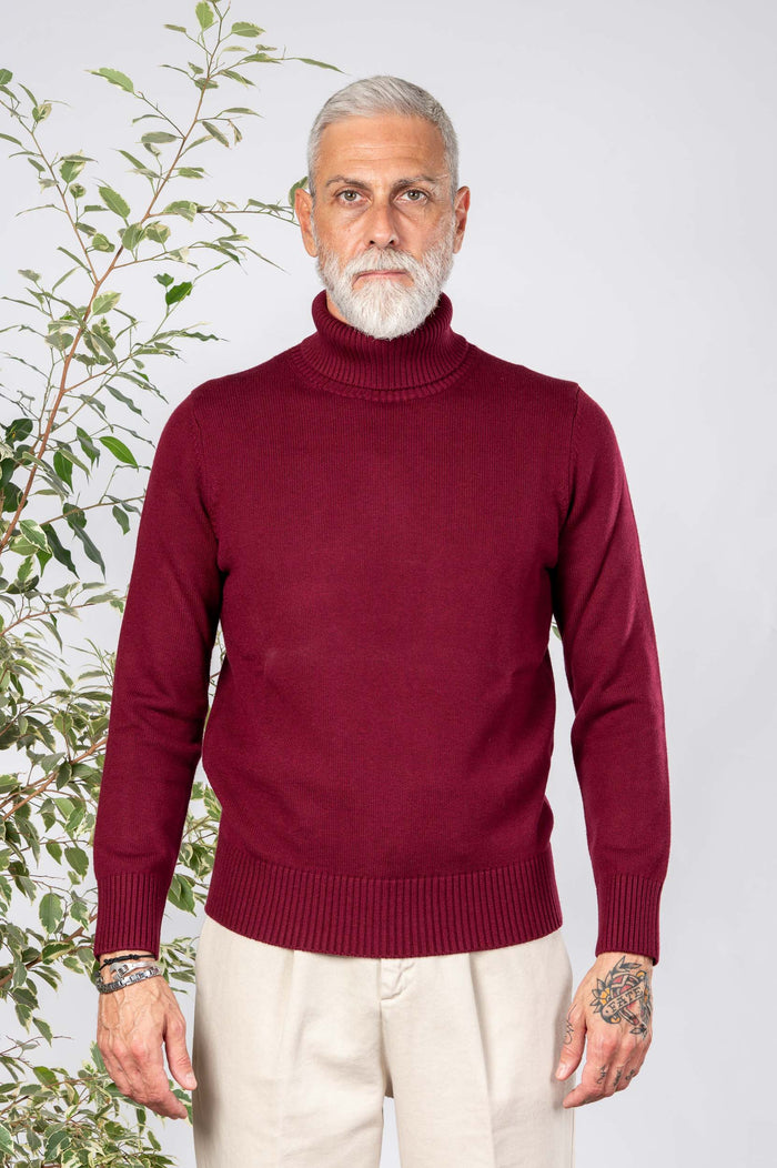 - Maglione dolcevita in 50% lana e 50% Cotone. Collo e polsini canettati. Fondo con bastonetto.