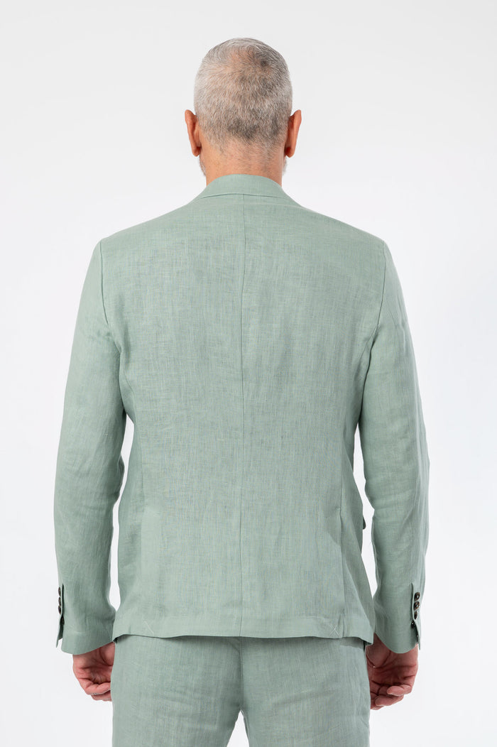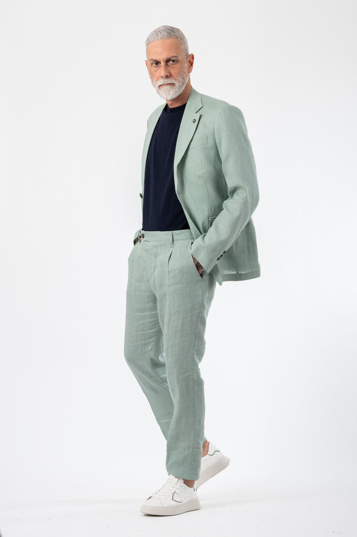 • Abito tinta unita monopetto in lino. Vestibilità slim con chiusura frontale monopetto con bottoni in contrasto. Rever con spilla. Tasche con pattina centrali. Retro doppio spacco. Pantalone vita regular coscia regular con fondo stretto.