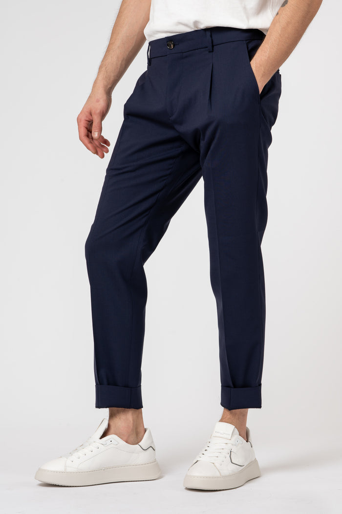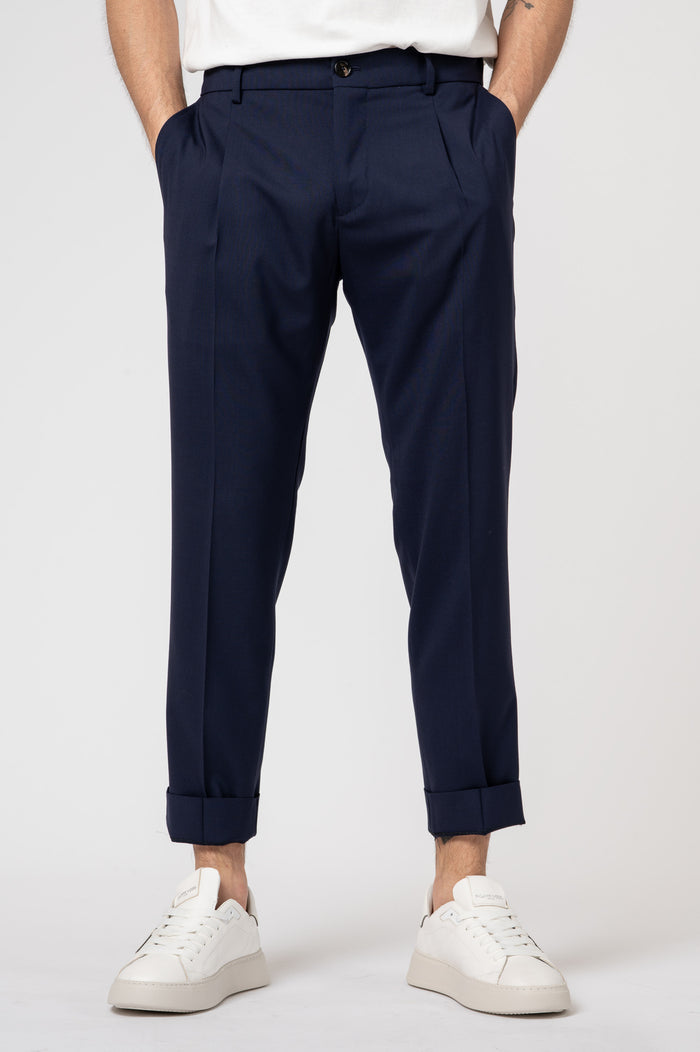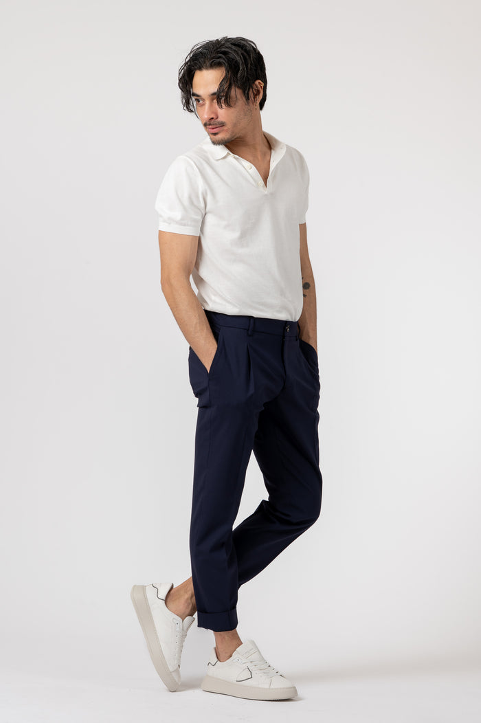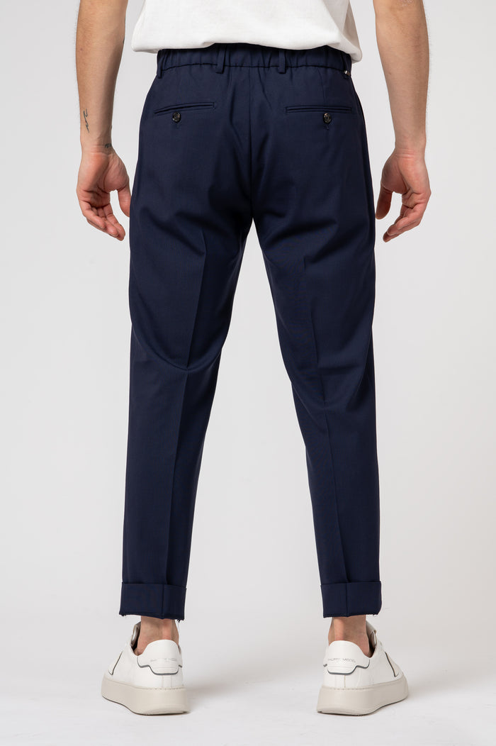 - Pantalone tinta unita in fresco lana. Vita alta elasticizzata. Coscia regular e fondo stretto . Tasche america e taschine retro a filo.