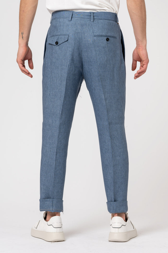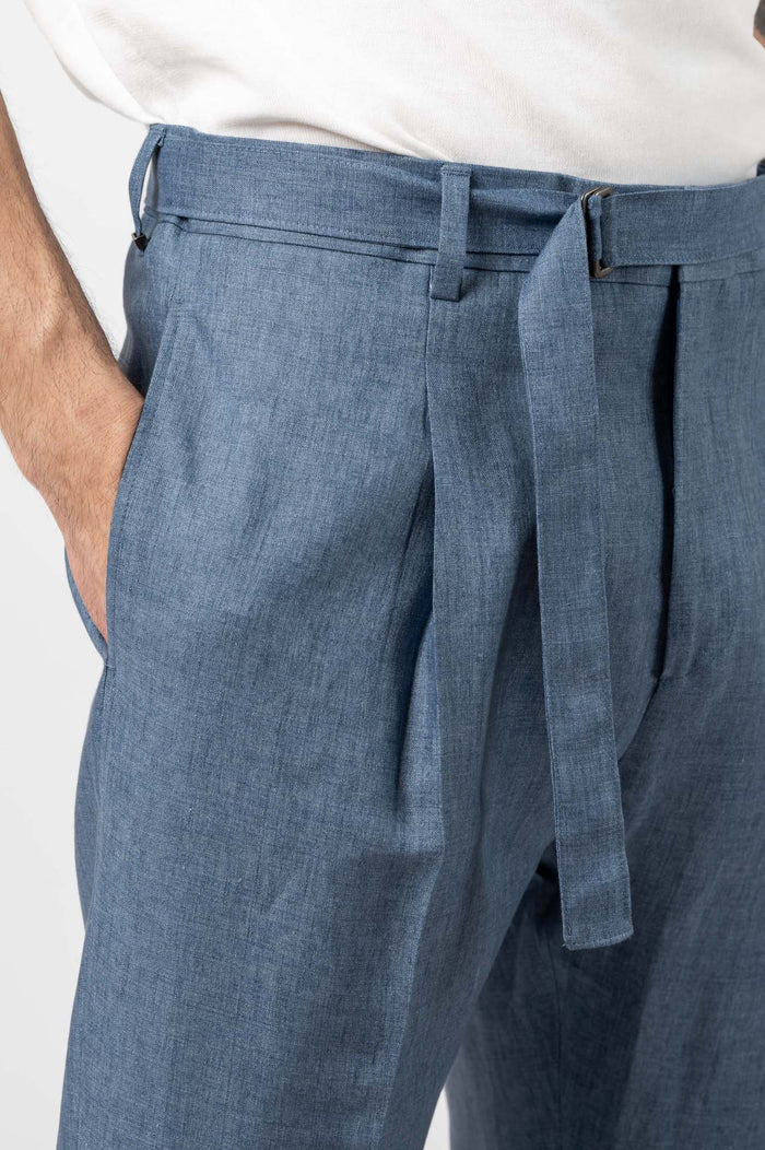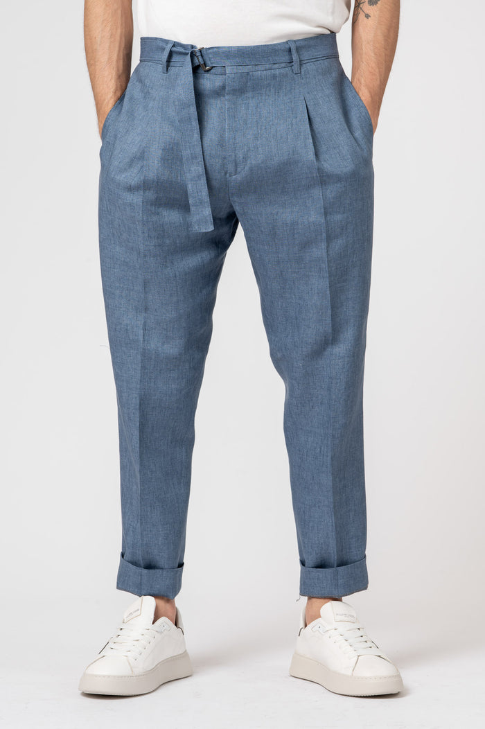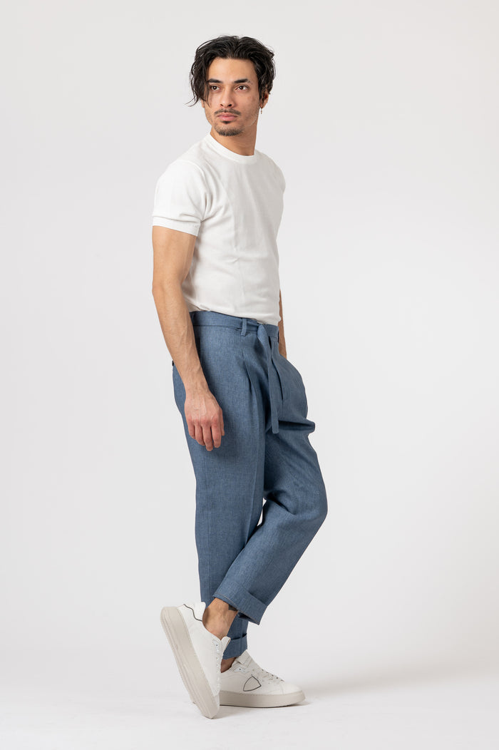 - Pantalone tinta unita in lino. Vita alta con cintura tinta su tinta in vita . Coscia regular e fondo stretto . Tasche america e taschine retro, una con pattina e una a filo.