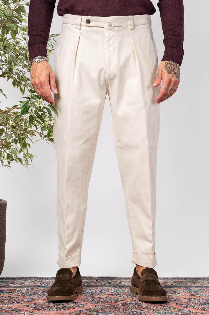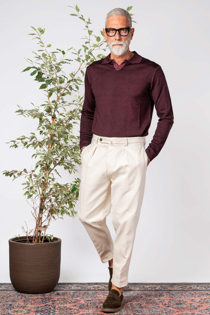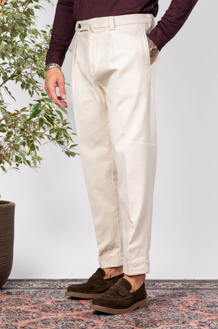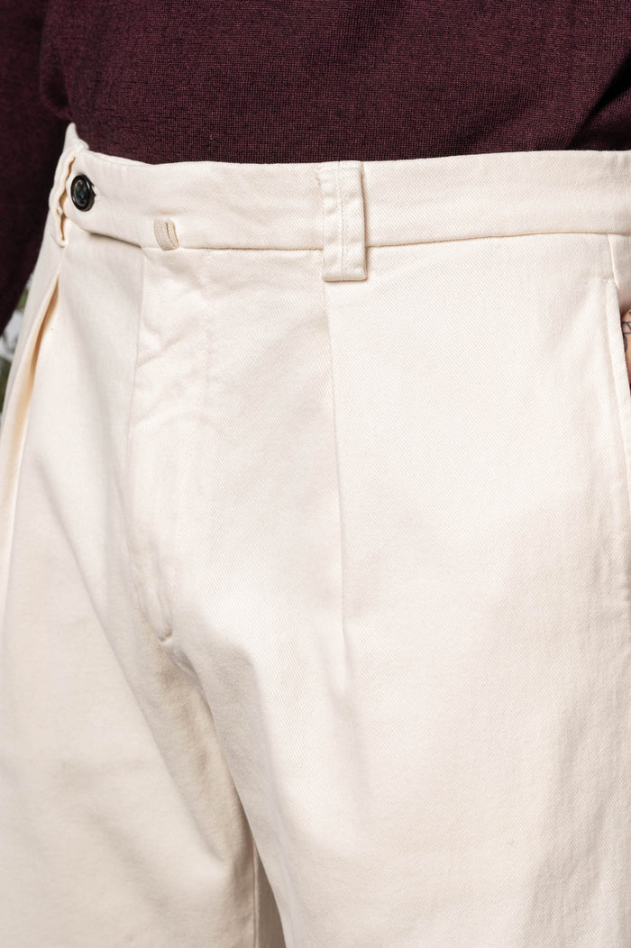 • Pantalone tinta unita in cotone. Vita alta, coscia comoda, fondo leggermente più stretto. Tasche a filo frontali, tasche retro una a filo e una con pattina.