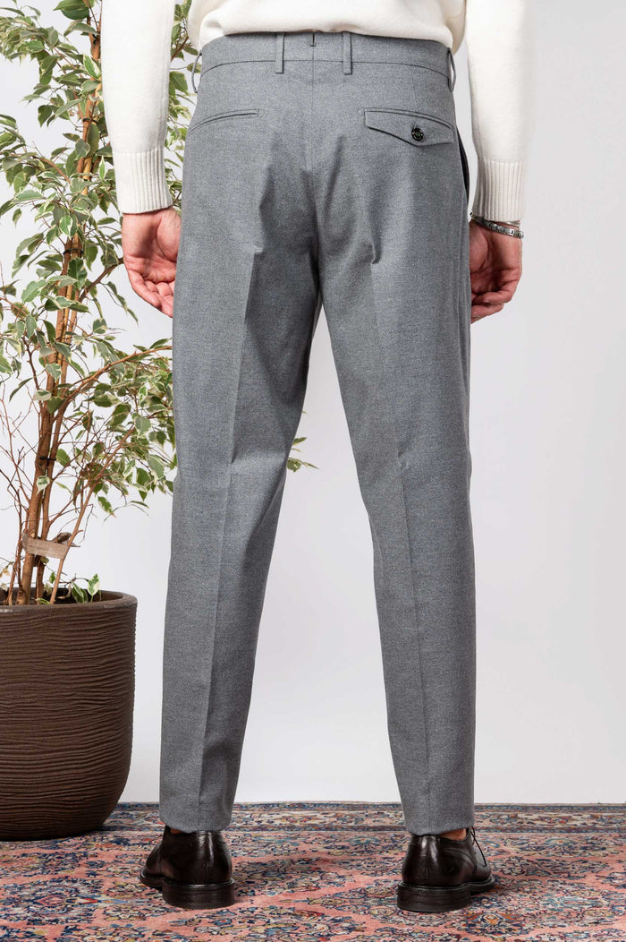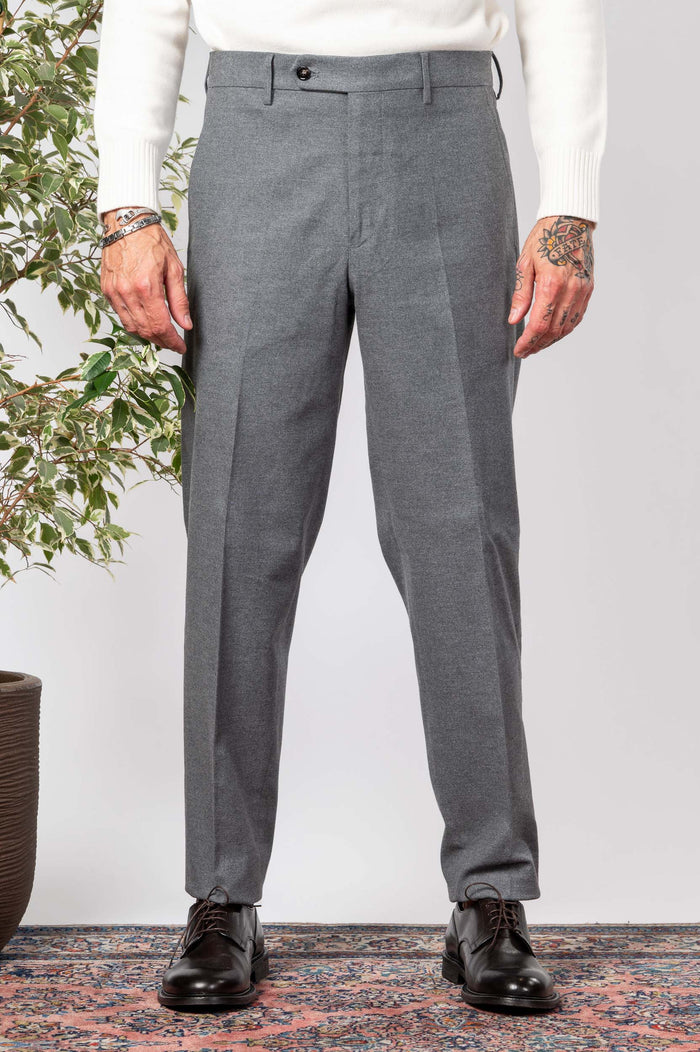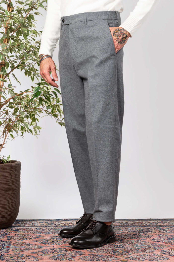 • Pantalone tinta unita in fresco lana. Vita alta, coscia comoda, fondo leggermente più stretto. Tasche a filo frontali, tasche retro una a filo e una con pattina.