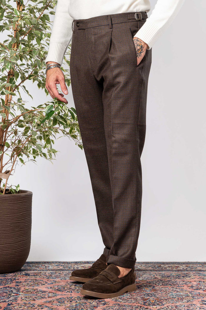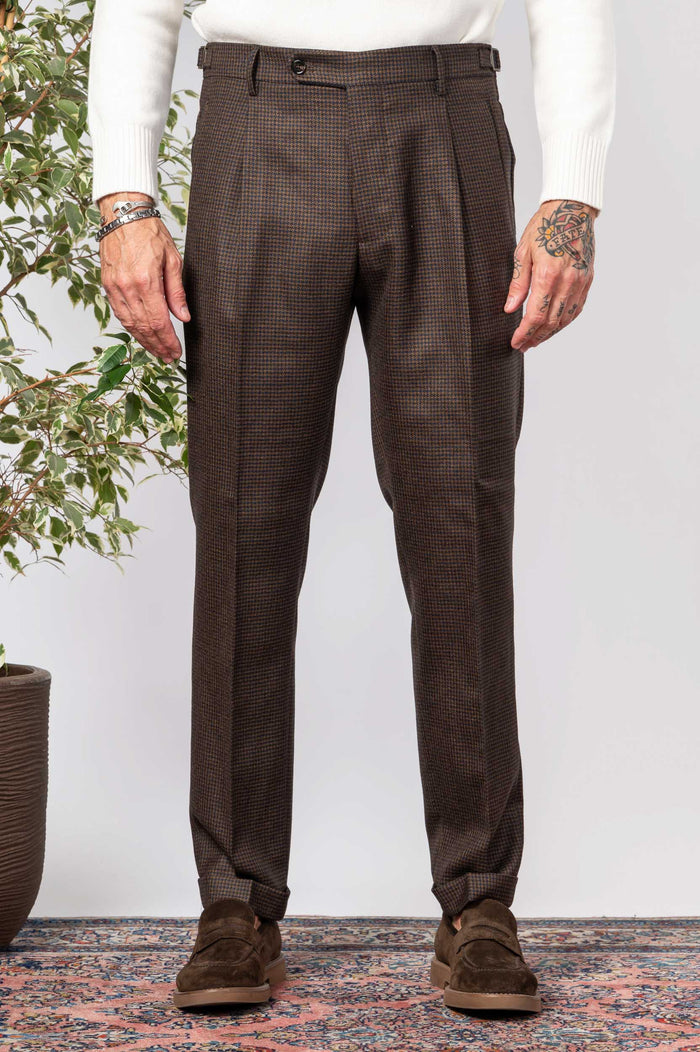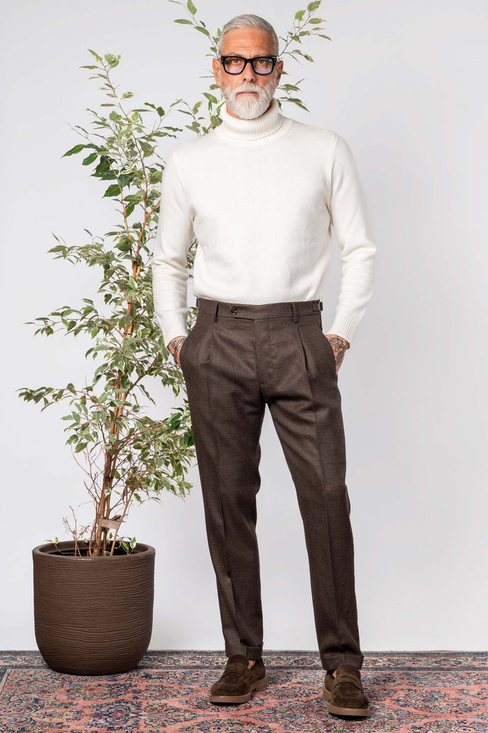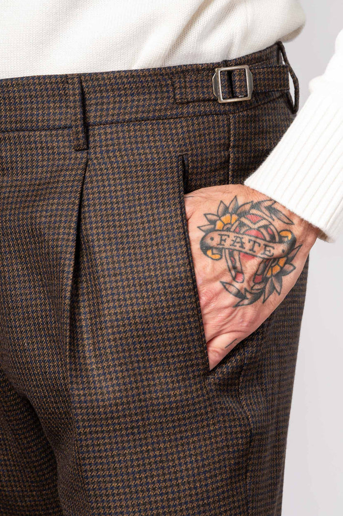 - Pantalone pied de poule in fresco lana. Vita alta, coscia comoda, fondo leggermente più stretto con risvolto. Tasche a filo frontali e posteriori.