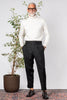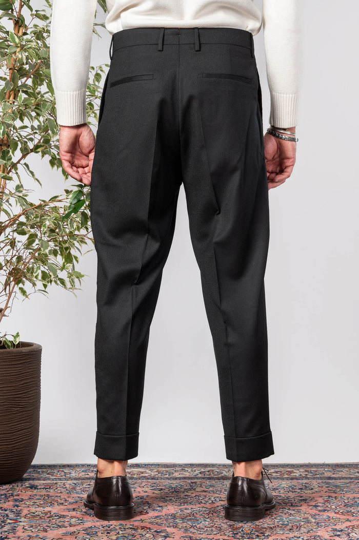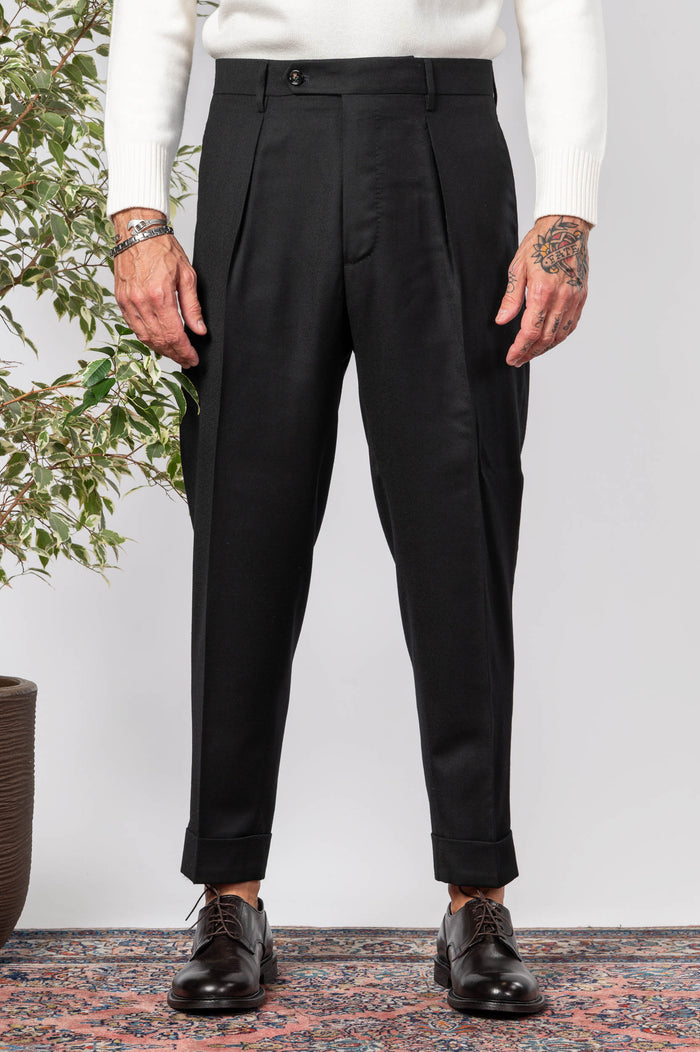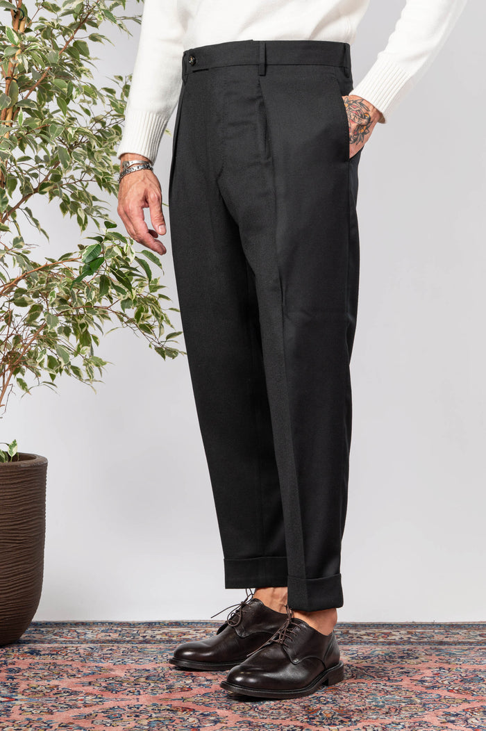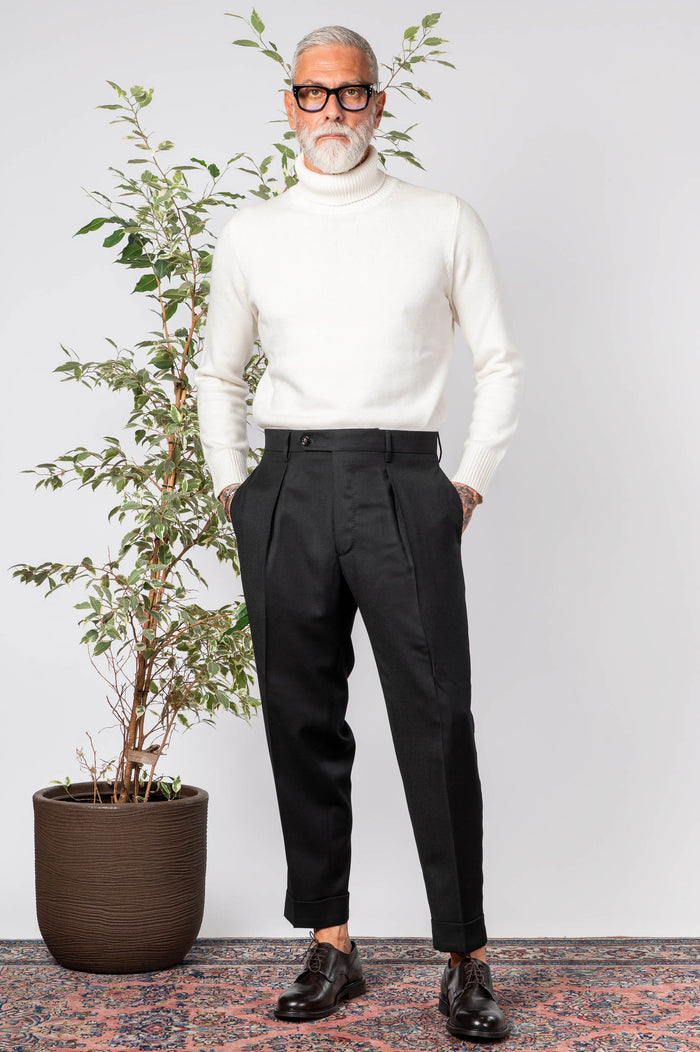 • Pantalone tinta unita in fresco lana. Vita alta, coscia comoda, fondo leggermente più stretto con risvolto. Tasche a filo frontali e posteriori.