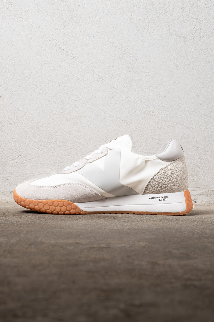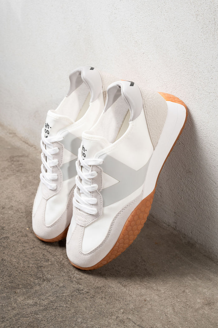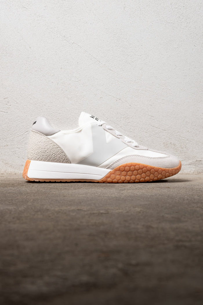 - Scarpetta tinta unita in pelle e tela, punta in pelle scamosciata scamosciata. Tacco in gomma. Logo in contrasto.