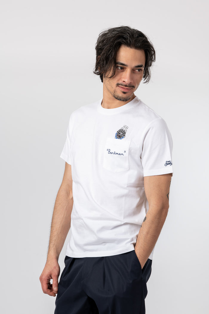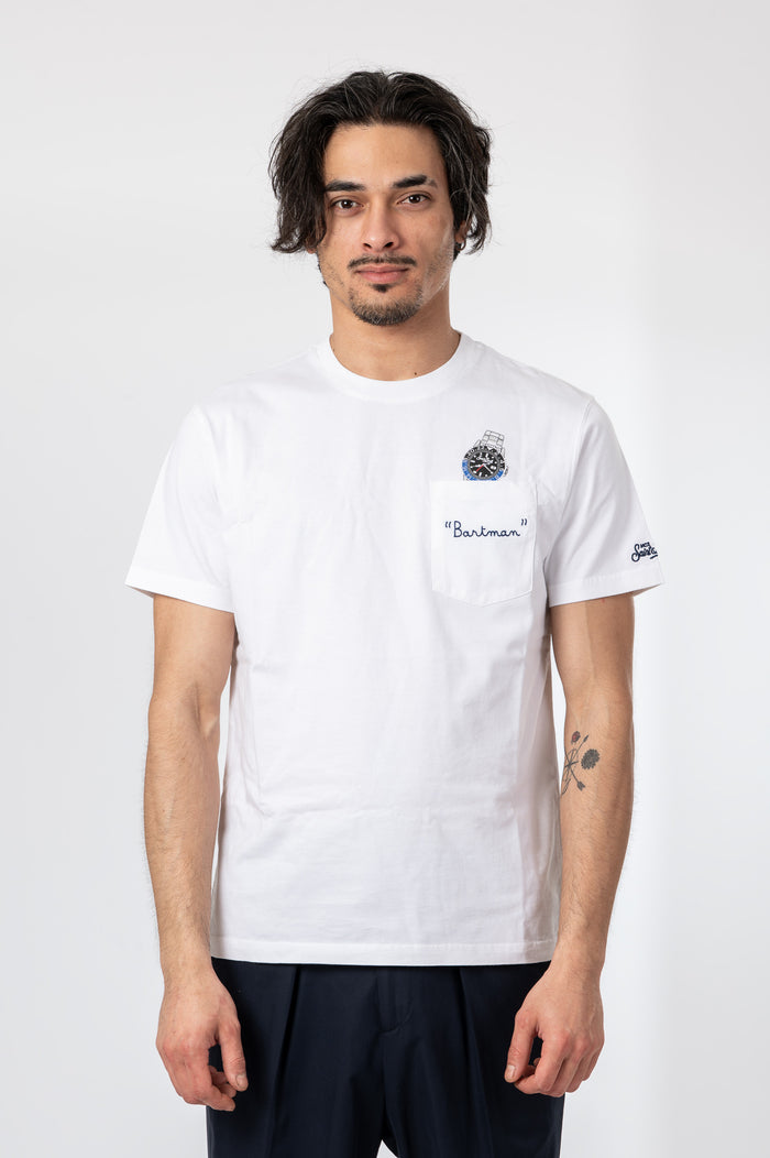 • T-shirt girocollo a maniche corte. Tinta unita in cotone elasticizzato. Stampa frontale orologio.