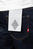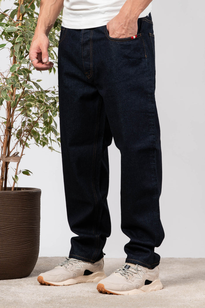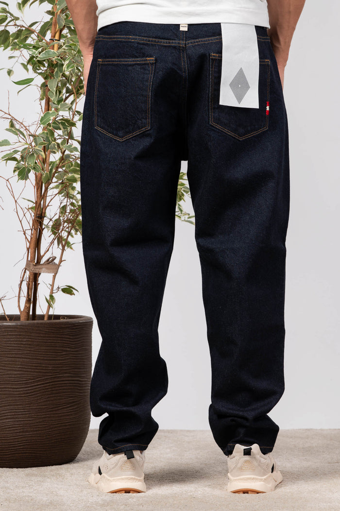- Jeans tinta unita in denim non trattato . Vita alta, coscia larga e fondo stretto. Cinque tasche con piccola cucitura logo posteriore. Effetto lavato