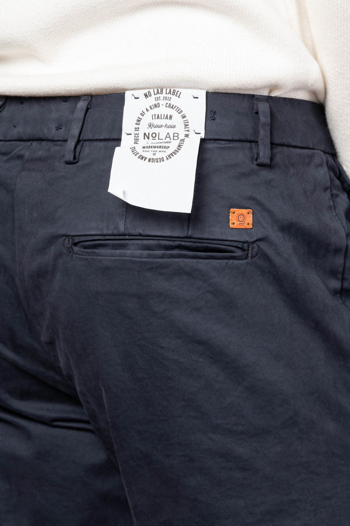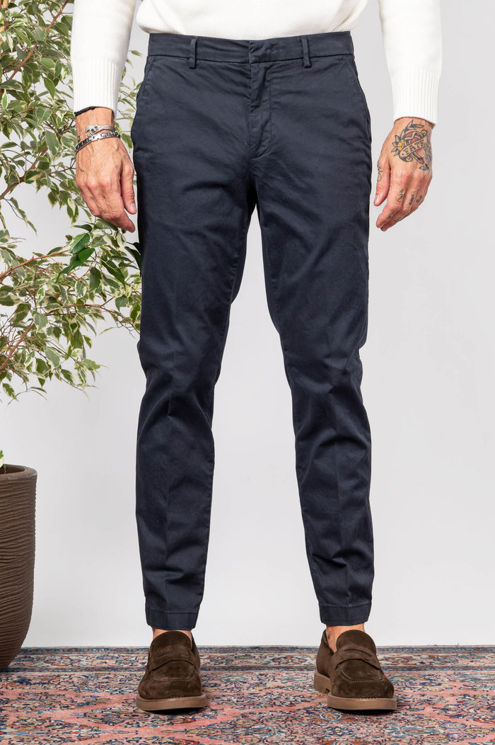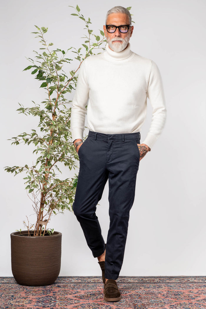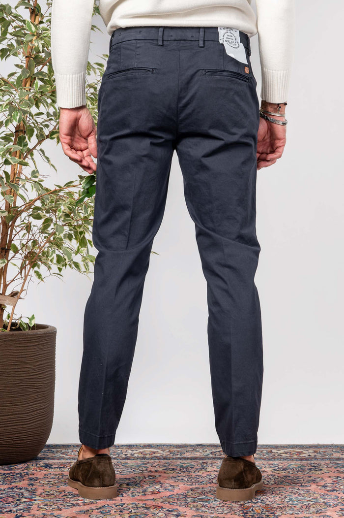 • Pantalone tinta unita in cotone. Vita alta . Coscia regular e fondo stretto . Tasche america e taschine a filo retro.