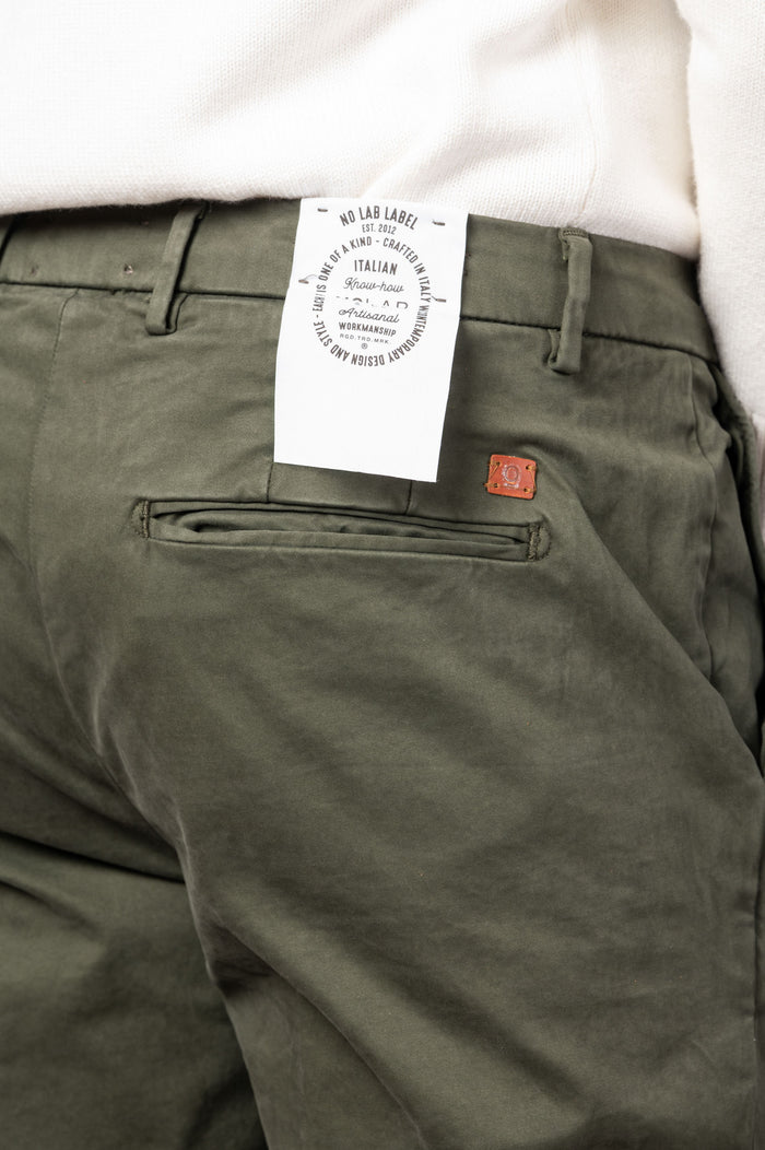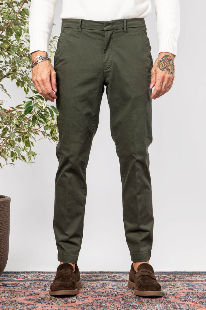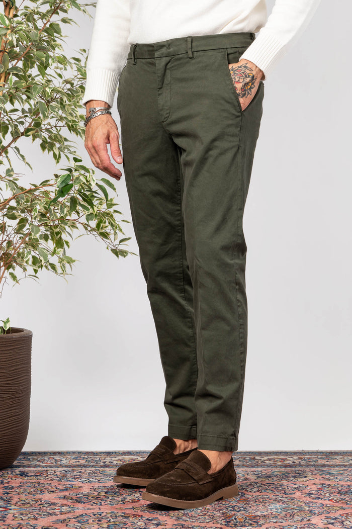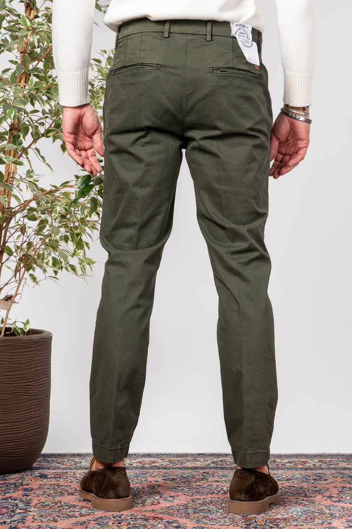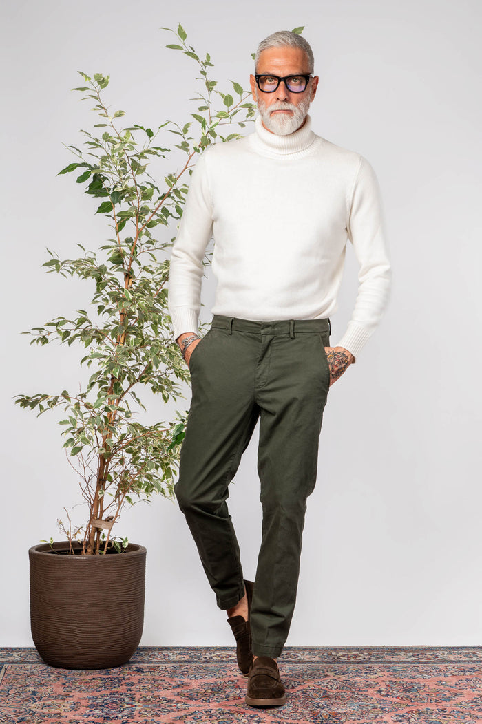 • Pantalone tinta unita in cotone. Vita alta . Coscia regular e fondo stretto . Tasche america e taschine a filo retro.